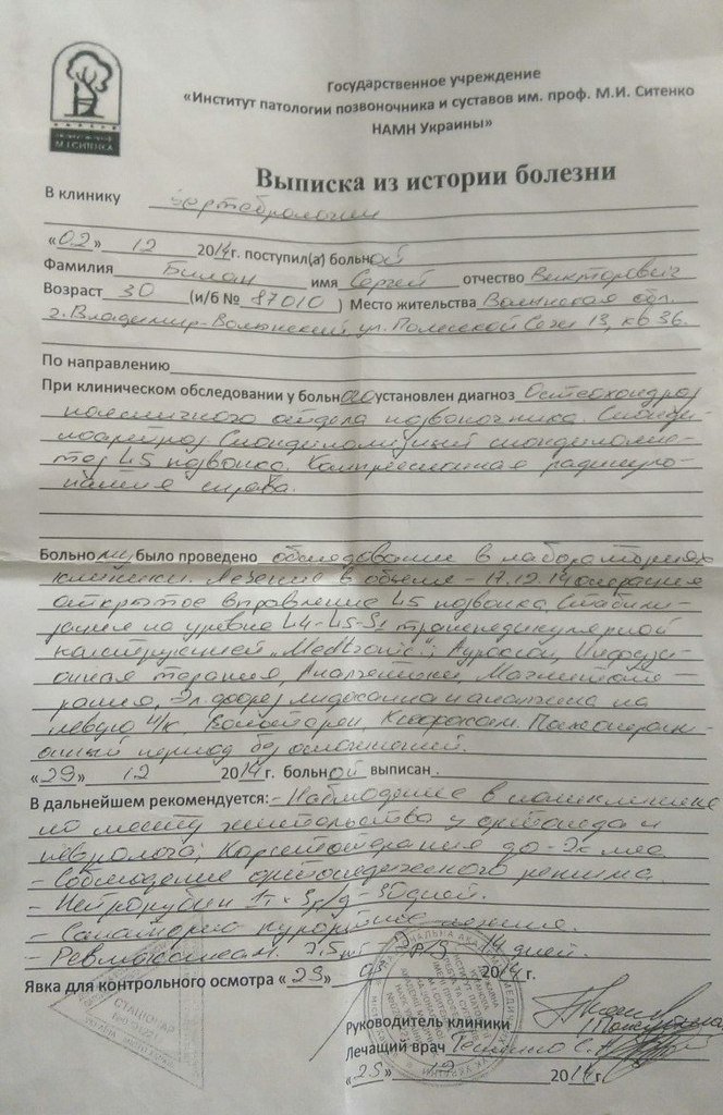 У Харківському державному інституті патології хребта і суглобів ім. проф. М.І. Сітенка, Сергію зробили операцію відкритого вправлення Л5 хребця. Та провели стабілізацію на рівні Л4,Л5-С1, конструкцією "медтронік". Тобто йому зафіксували хребет за допомогою металевих з'єднань.