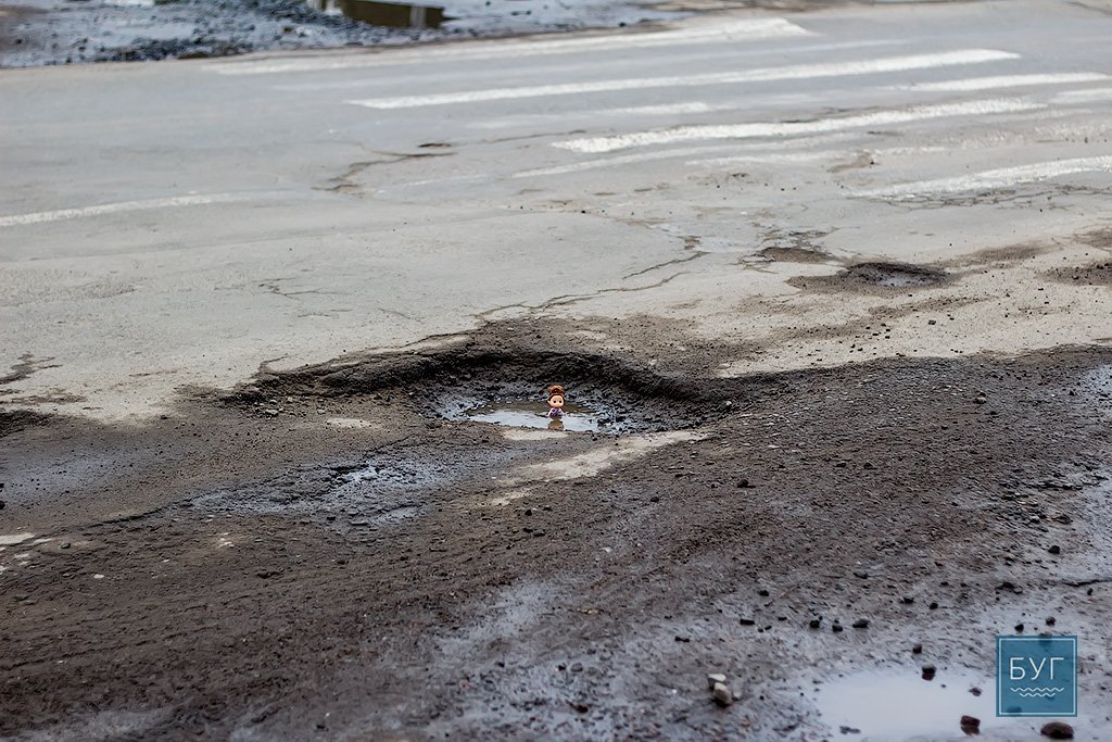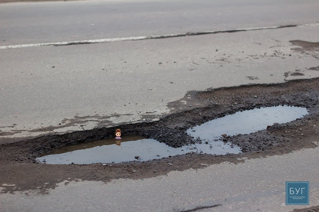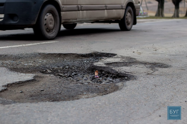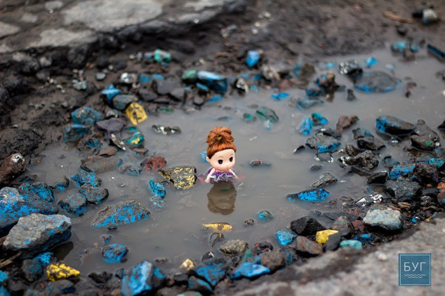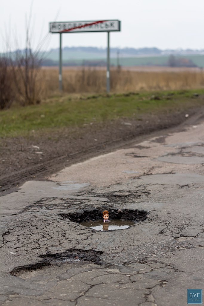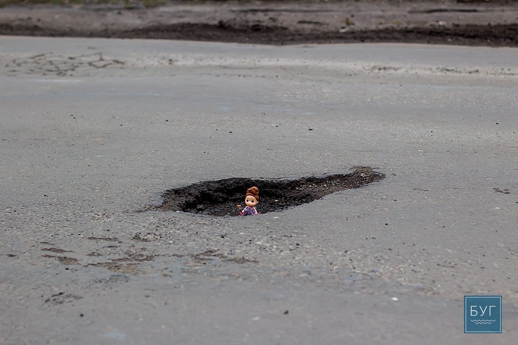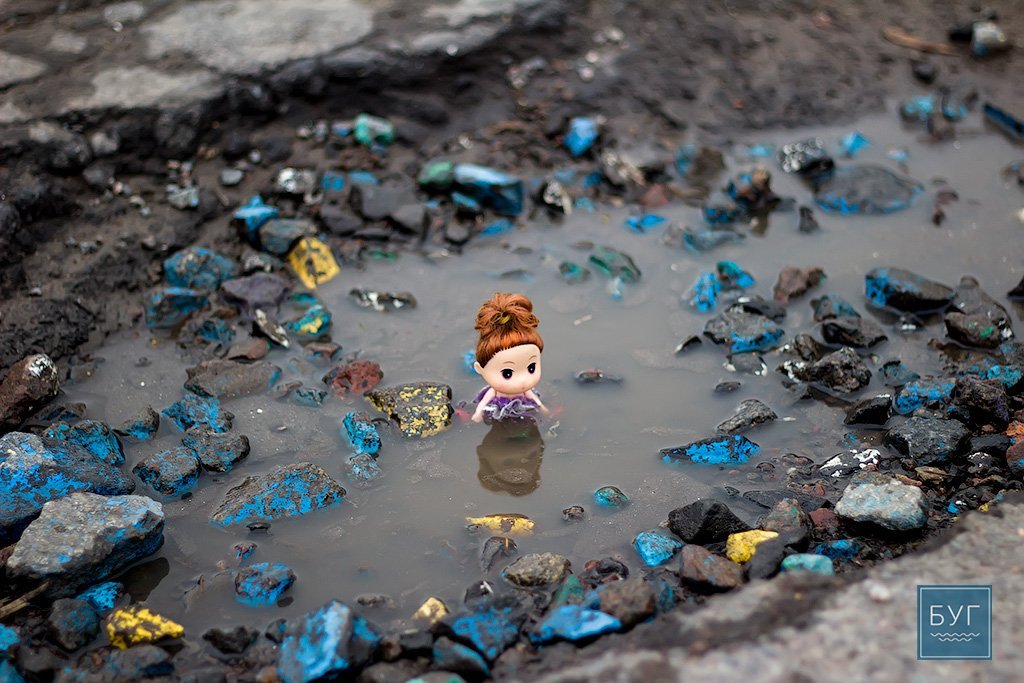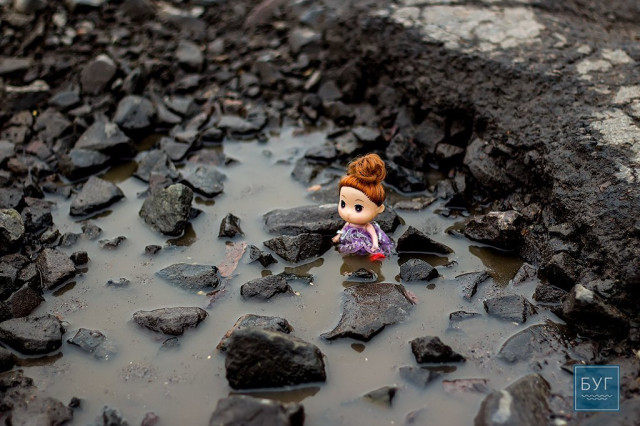 Нагадуємо, – “Інспектор Ляля” у сидячому положенні вона має ріст 6 сантиметрів, тому і послужить нам своєрідним мірилом, яке візуально покаже, які глибокі та небезпечні насправді вибоїни на дорогах.