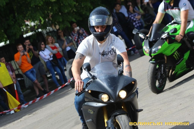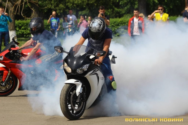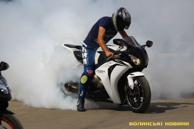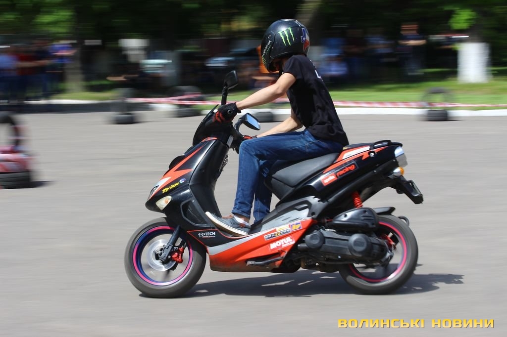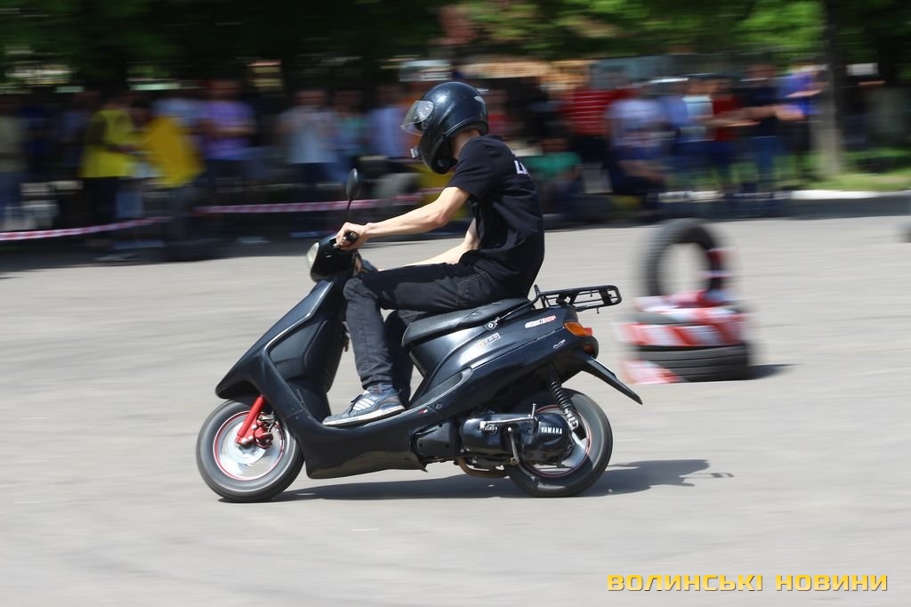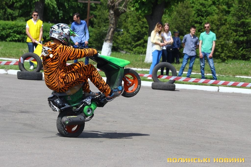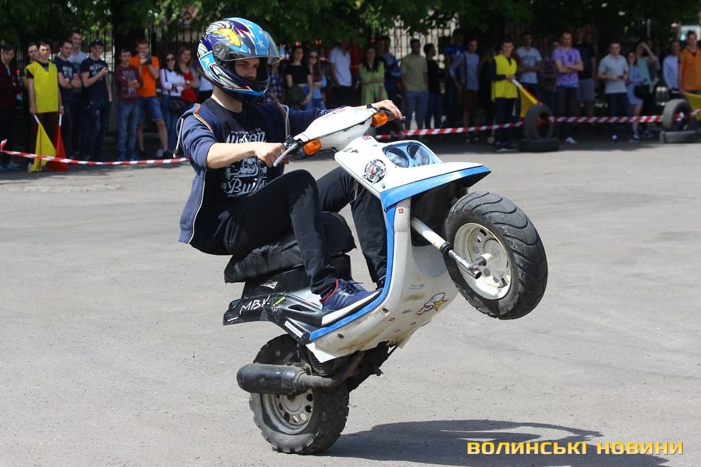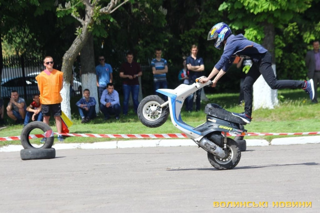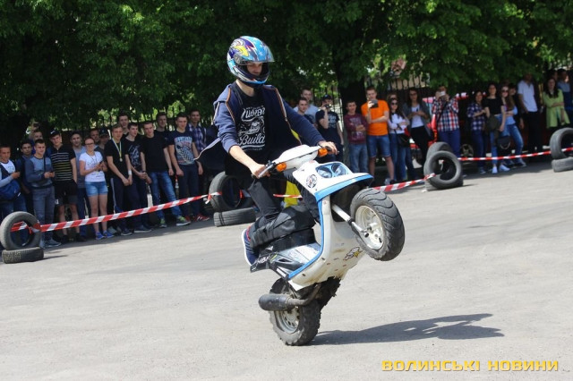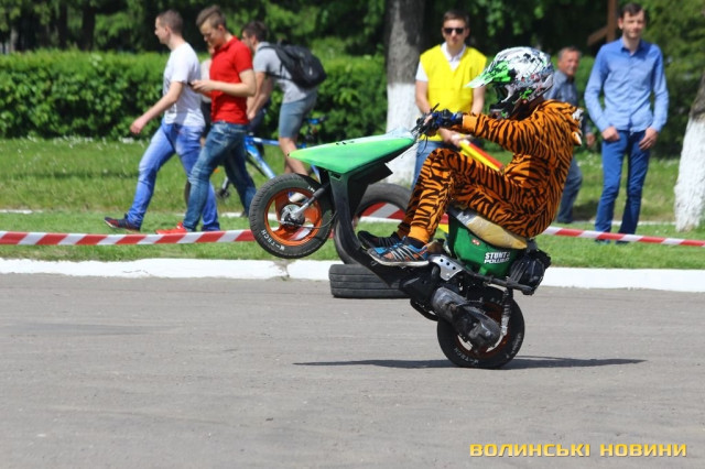 Програма розпочалась зі стант-шоу – так називають виконання трюків на мототехніці. Як пояснили учасники, для того, аби палити гуму, стоячи на місці, кататись на задньому колесі та виконувати інші вправи, достатньо навіть простого скутера, якого потрібно лише дещо модернізувати.