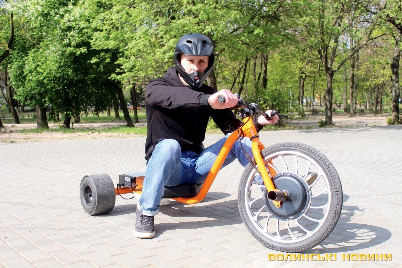 Водій за кермом перебуває практично напівлежачи. У його розпорядженні – гальма та педаль газу. Ногами впирається на виступи, що додані до переднього колеса. Якщо важіль гальм нагадує мотоциклетний чи велосипедний, то кнопка для газу – маленька й підлаштована під великий палець. Це зроб¬лено для того, аби координувати рух під час вивороту керма.Виріб недешевий – у межах півтори тисячі доларів. Найдорожчими деталями є тонкий електродвигун, схований у переднє титанове колесо, та акумулятор, що кріпиться за сидінням. Заводиться пристрій ключем, а заряджається від звичайної розетки, як електромобіль. Потужність акумулятора дозволяє інтенсивно їздити до 3-3,5 годин, переконує співрозмовник. До чотирьох годин потрібно для повного заряду. Акумулятора вистачає на 2-2,5 тисячі циклів заряду-розряду.