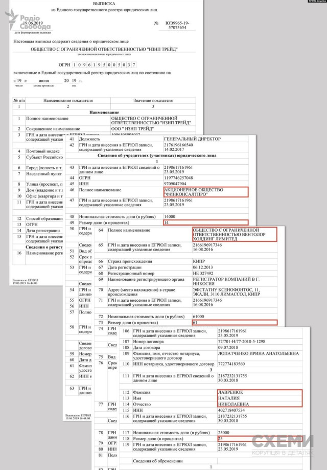 За станом на 19 червня 2019 року частки підприємства розподілилися таким чином: Ventolor Holding LTD – 61%, Наталія Лавренюк – 25% та АО «Фінконсалтпро» – 14%. На кінець травня структура кіпрських фірм не змінювалася – бенефіціаром значилася Оксана Марченко.