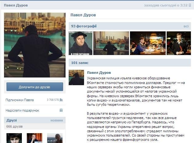 Дуров заявляє, що міліція вилучила сервери Вконтакте в Києві
