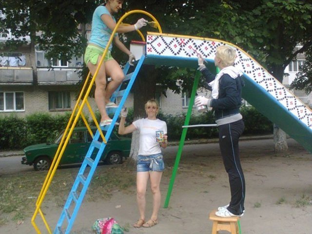 Це вже не цікаво і набридло! Дітям інші кольори не потрібні? На Заході і молоді і дорослим не треба розповідати і навчати про патриотизм, а от у Слов'янську, Краматорську, Донецьку, Луганську... таки б майданчики поновити і розфарбувати, от туда фарбу направляйте!!! А у нас тут - це вже якось виглядає як...не зрозуміло що!!!