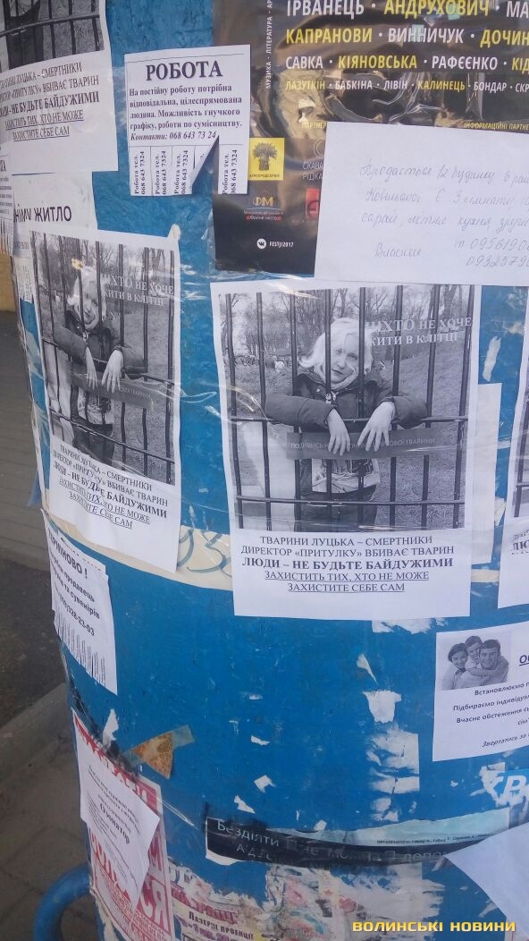 Інформаційні тумби у центрі Луцька обклеїли листівками з закликами захистити тварин від директора КП «Ласка» Дани Новарчук.