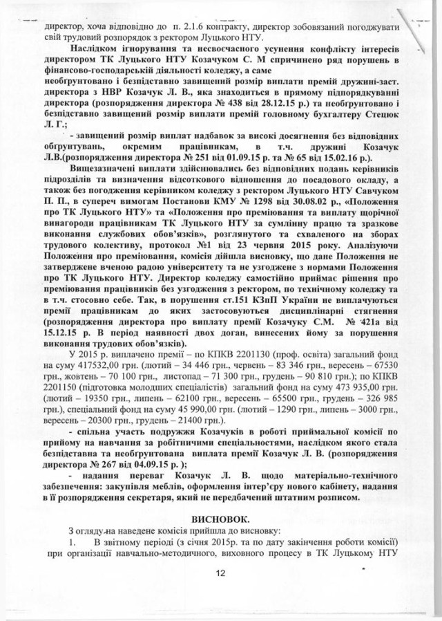 Також під час перевірки фінансової діяльності навчального закладу комісія виявила необгрунтовано і безпідставно завищені розміри виплати премій і надбавок низці працівників, серед яких фігурує дружина директора коледжу, заступник директора з навчально-виховної роботи Козачук Л. В.