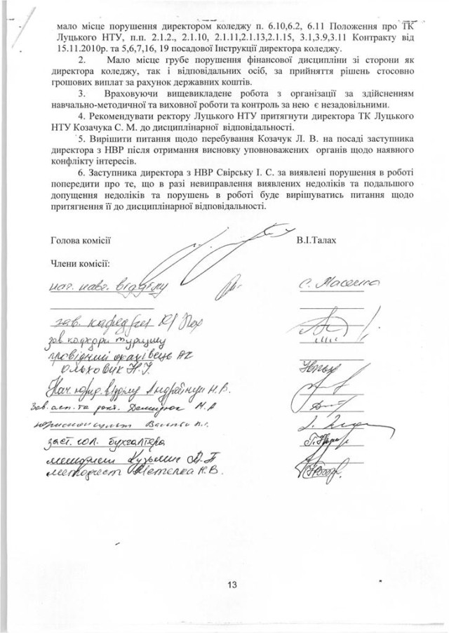 За результатами перевірки комісія рекомендувала притягнути директора коледжу до дисциплінарної відповідальності, а також вирішити питання щодо перебування Козачук Л. В. на посаді заступника директора з НВР.