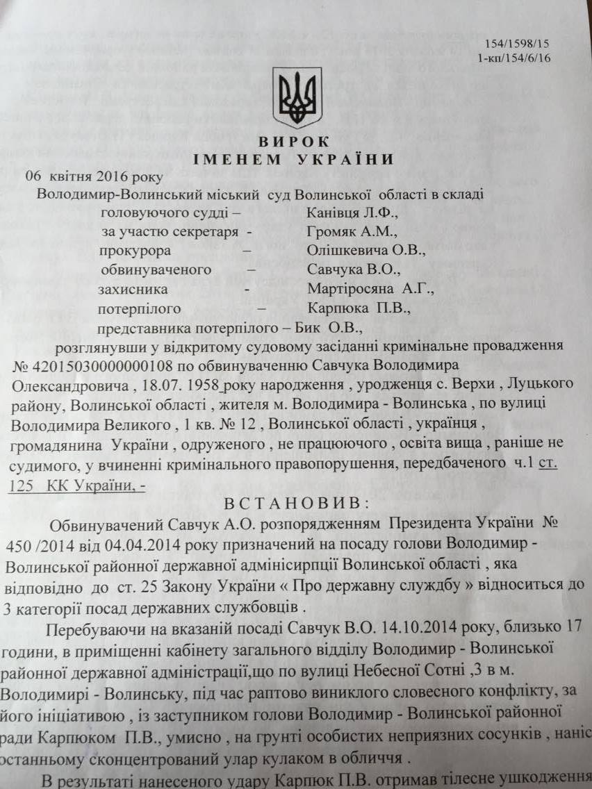 Нагадаємо, 14 жовтня 2014 року, Володимиром-Волинським прокотилася новина про побиття заступником голови районної ради Павлом Карпюком голови Володимир-Волинської РДА Володимира Савчука. Як повідомлялося, після словесної перепалки голова райдержадміністрації отримав тілесні ушкодження, за цим фактом міліція розпочала кримінальне провадження.