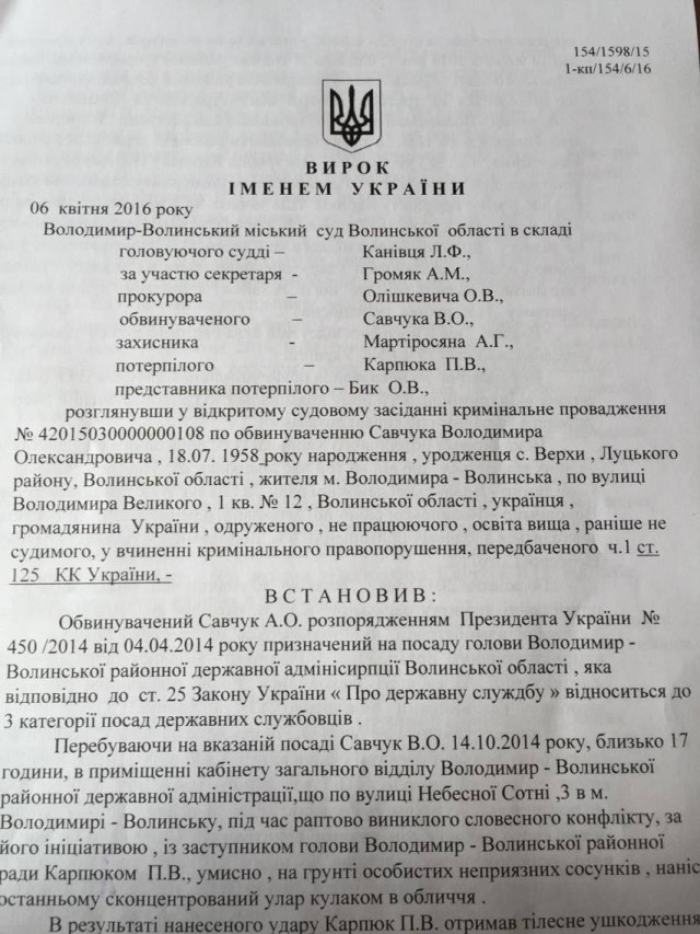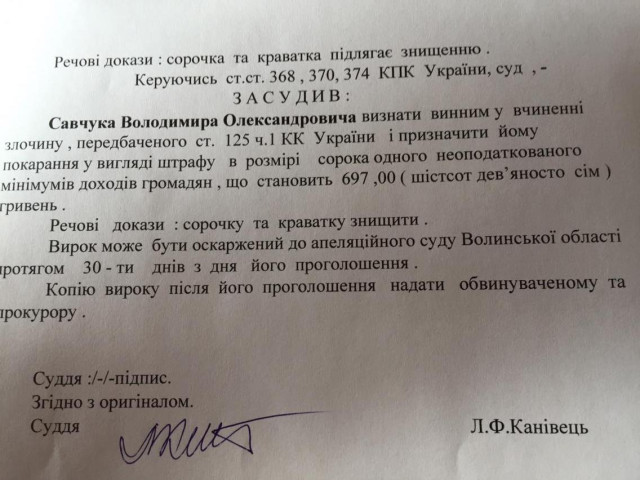 За такі дії, уже екс-посадовця Володимира Савчука суд визнав винним за ст. 125 ч. 1 Кримінального Кодексу Україні і наклав на нього штраф у сумі 697 гривень.