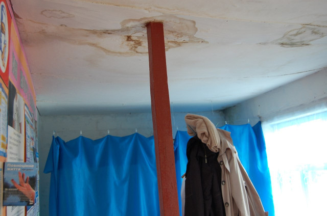 Молода фельдшерка Наталія Гірич зустрічає нас на порозі ФАПу. Щоби зайти до приміщення, доводиться згинатися, аби не вдаритися об одвірок. Низька стеля в коридорі прогнулася та набралася води. Її підперли палкою, аби не обвалилася зовсім. «Тут у дощ на голову вода капає», – коментує Наталія.