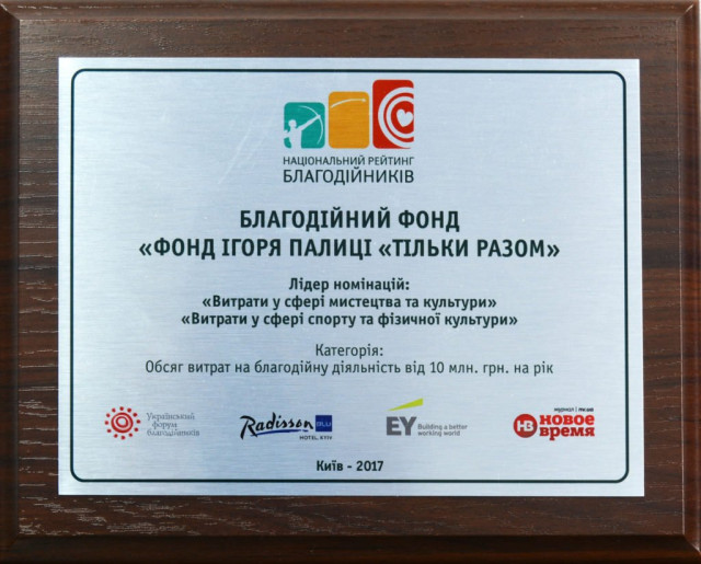 Отже, Фонд Ігоря Палиці «Тільки разом» став лідером у найбільш вагомій категорії «Обсяг витрат на благодійну діяльність від 10 млн грн на рік» в таких номінаціях: «Витрати у сфері мистецтва та культури» й «Витрати у сфері спорту та фізичної культури». Про це інформують у прес-службі Фонду.