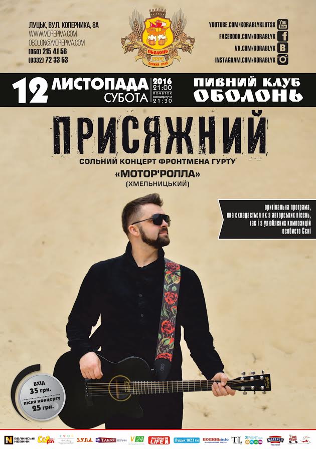 З сольним концертом у пивному клубі «Оболонь», відомому як Кораблик, виступить фронтмен гурту «Мотор’ролла» Сергій Присяжний.
