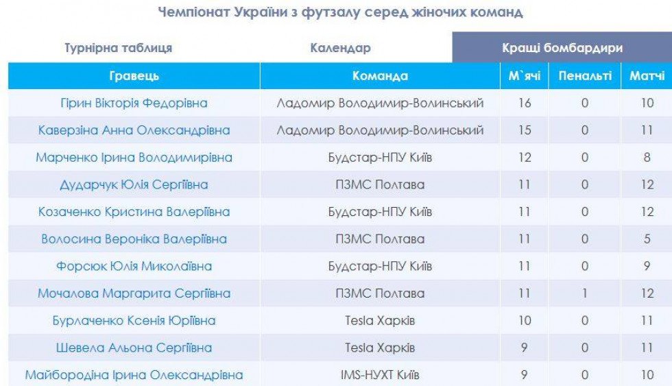 Найкращим бомбардиром Вищої ліги і Кубка України серед жінок стала 19-річна гравчиня володимир-волинської команди «Ладомир» і збірної України WU-19 з футболу Вікторія Гірин.