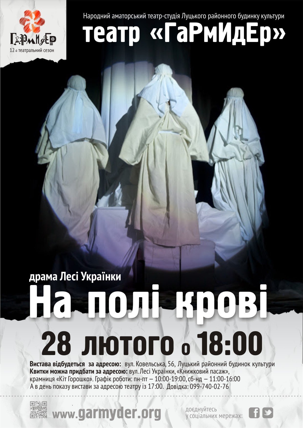 Народний аматорський театр-студія Луцького районного будинку культури «ГаРмИдЕр» покаже 28 лютого драматичну виставу авторства Лесі Українки «На полі крові».