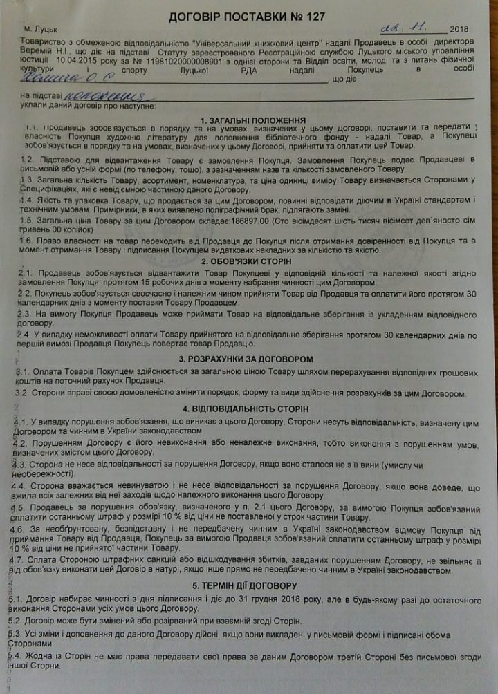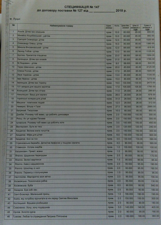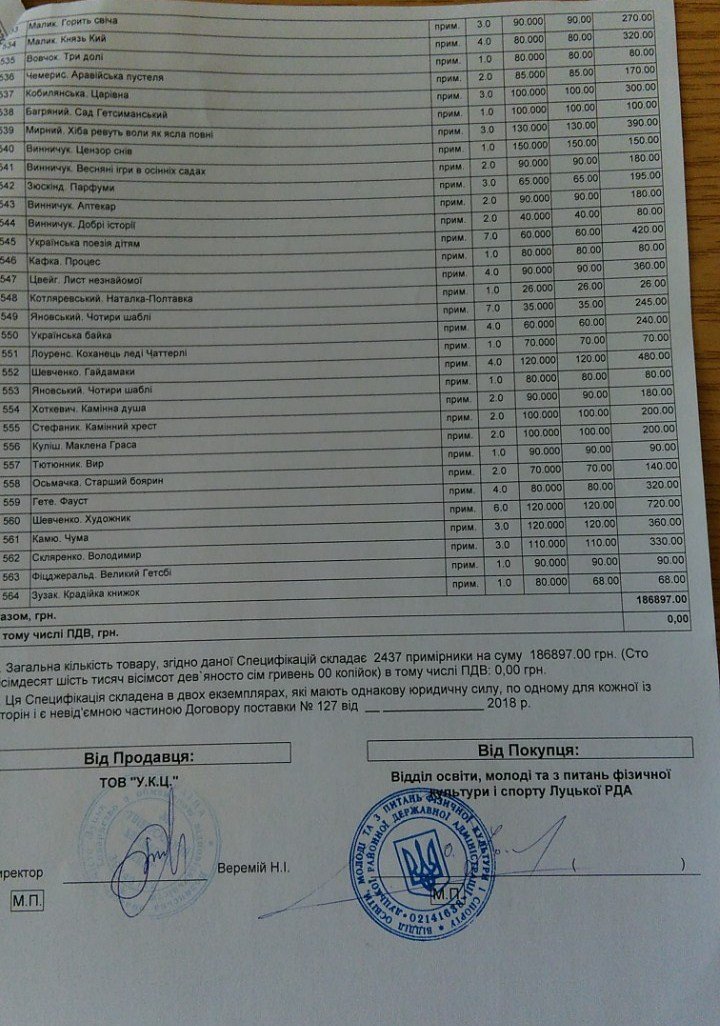 Комплект художньої літератури для поповнення фонду шкільних бібліотек закуповує відділ освіти, молоді та з питань фізичної культури і спорту Луцької райдержадміністрації. Відповідно до договору, укладеного 22 листопада з ТзОВ «Універсальний книжковий центр», вартість комплекту літератури становить 186,897 тисячі гривень.