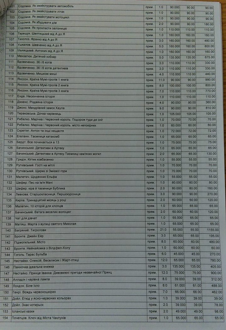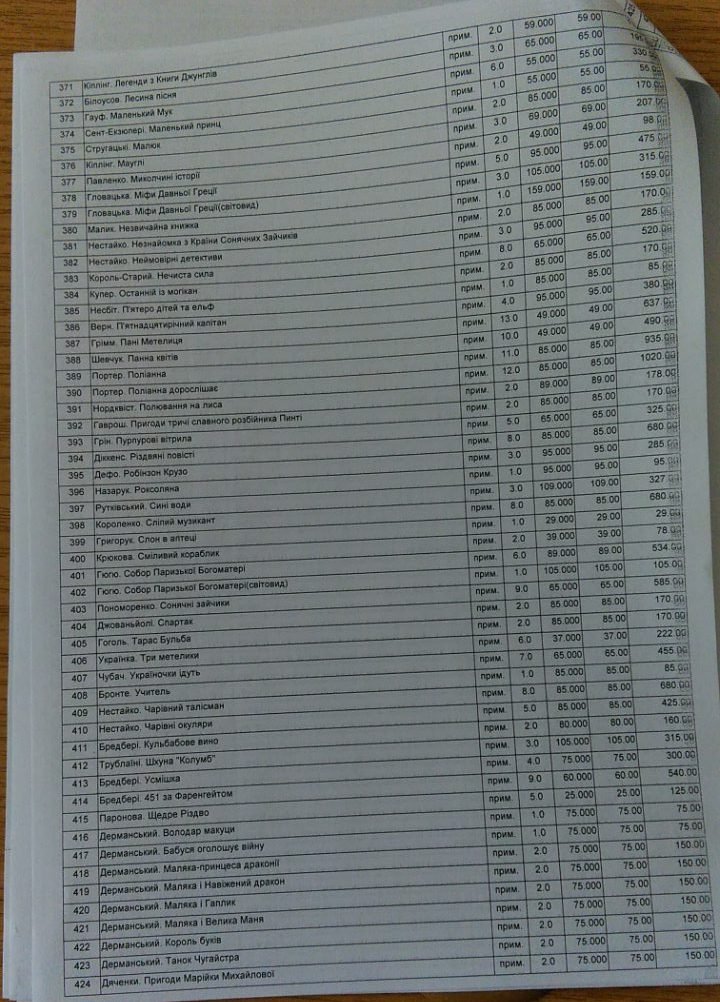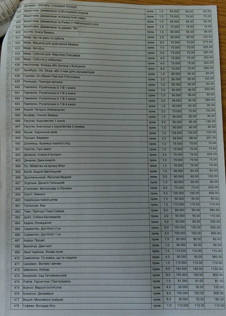 До переліку з 564 найменувань увійшли, зокрема, збірка еротичних оповідань сучасного українського письменника Юрія Винничука «Весняні ігри в осінніх садах», вісім примірників «Кобзаря» Тараса Шевченка вартістю по 140 гривень (цікаво, що вартість окремих видань цієї книги в інтернет-книгарнях стартує від 60-70 гривень), чотири примірники його ж «Гайдамаків» по 120 гривень за примірник (ціна в інтернет-книгарнях стартує від 29 гривень),низка видань Джоан Ролінг про Гаррі Поттера вартістю по 130 гривень за примірник та велика кількість творів класиків світової та української літератури, а також сучасних письменників.