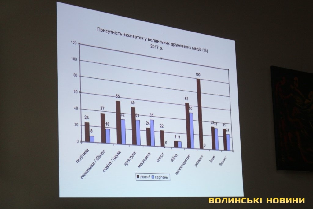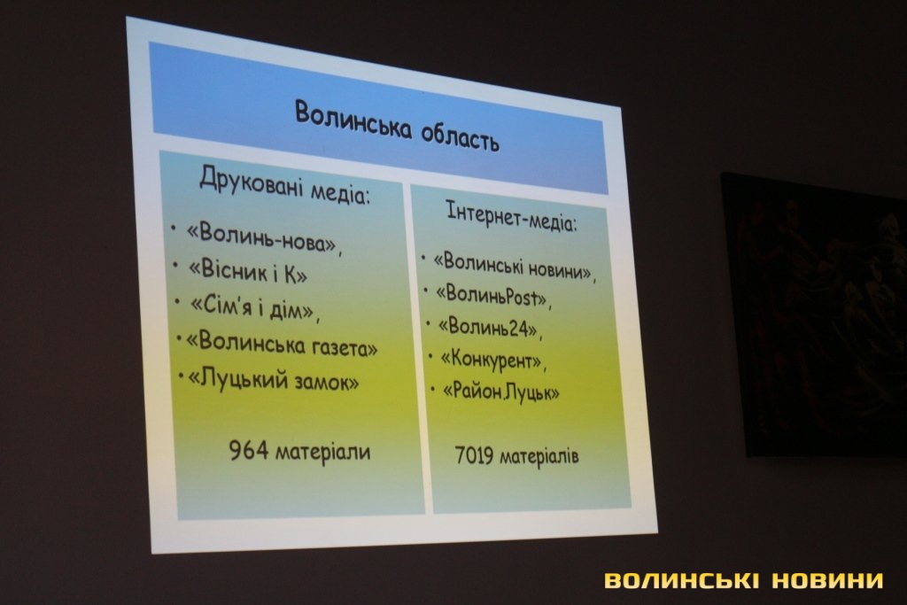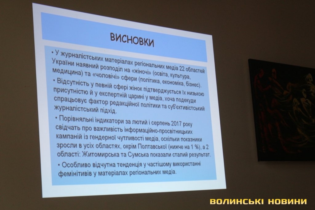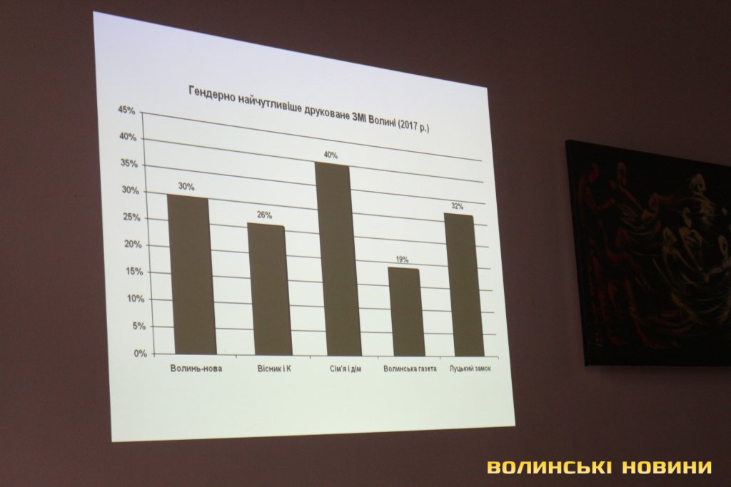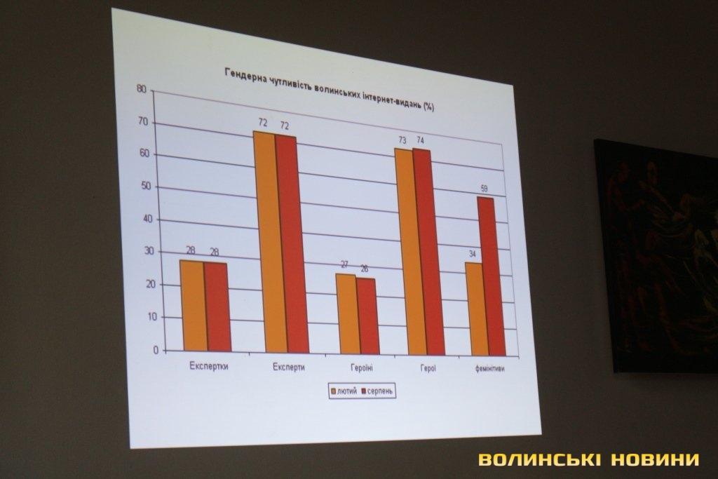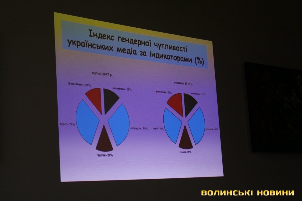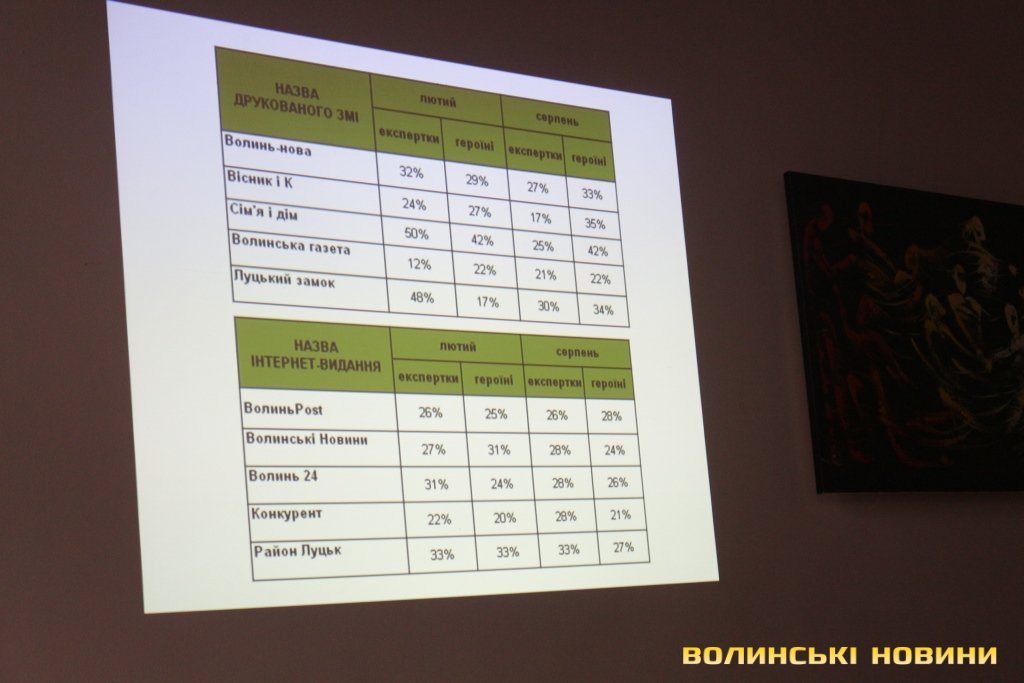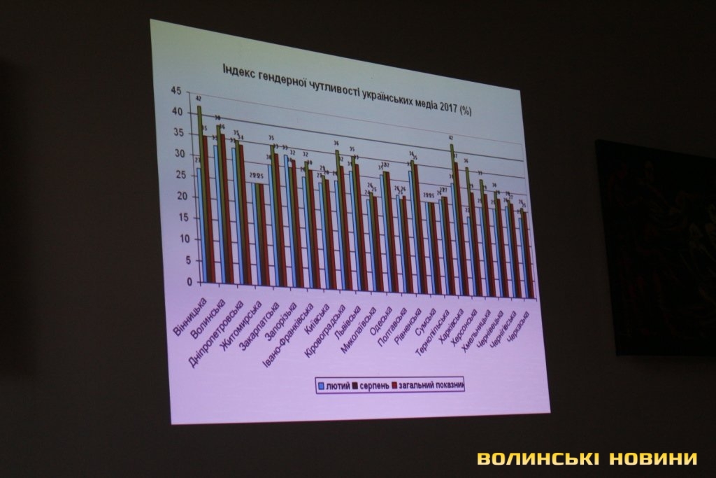 Координаторка Волинського прес-клубу, керівниця проекту «Гендерний простір сучасної журналістики: від теорії до практики» Богдана Стельмах розповіла, що для визначення рівня гендерної чутливості медіа України моніторингова група дослідила більше 180 тисяч матеріалів друкованих ЗМІ та інтернет-ресурсів (по 110 видань) у 22 областях (окрім Донецької, Луганської областей та Криму).