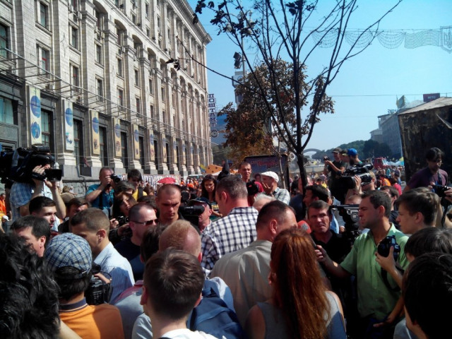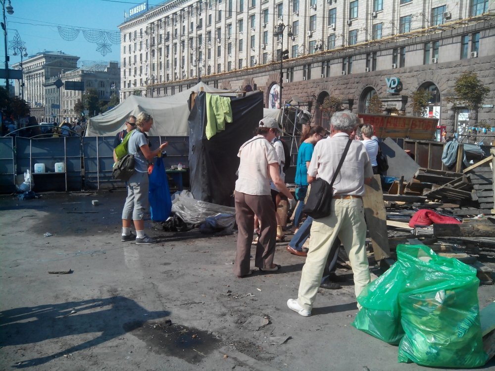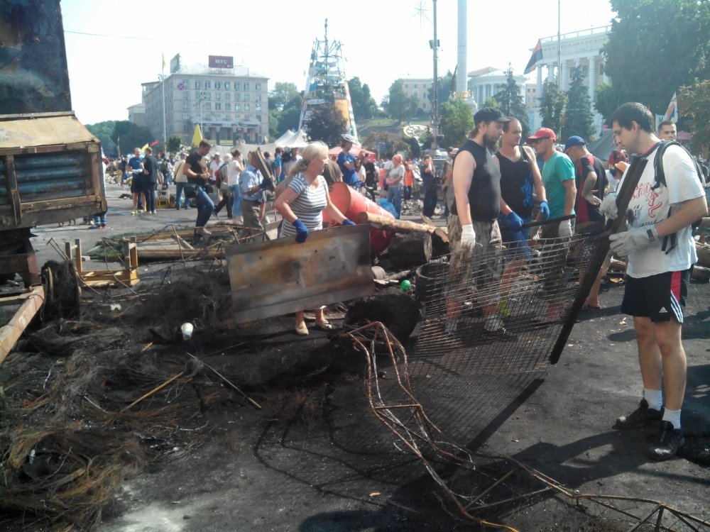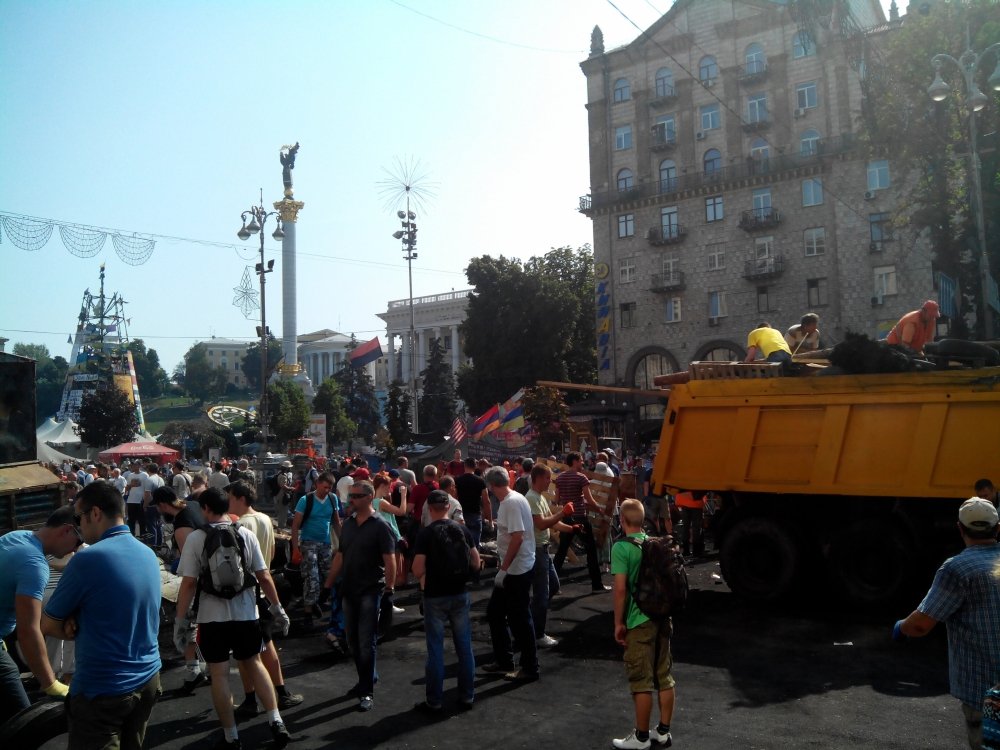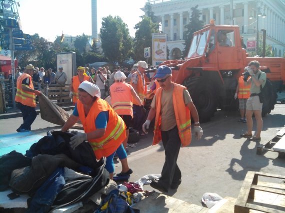 Крім цього інциденту, розбір завалів та сміття проходить без інцидентів. Майданівці розбирають особисті речі з наметів, а комунальники з активістами-добровольцями виносять сміття. Наразі, за півгодини прибирання, вже вивезли три вантажівкі сміття.