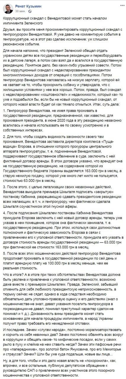 Що в підсумку? А в підсумку при таких обставинах Венедіктова повинна бути звільнена і притягнута до кримінальної відповідальності, можливо, навіть разом із прем’єром Шмигалем. Щоправда, Зеленський, який забув скасувати для себе улюбленого президентську недоторканність, в тюрму зараз не сяде, проте під час слідства необхідно обов’язково дати кримінально-правову оцінку і його діям (знав про шахрайство – не знав; давав вказівки поселити генпрокурора в держрезиденції – не давав; розумів злочинний характер угод – не розумів тощо). Доведена вина президента може стати підставою для початку процедури імпічменту, а народ України отримає право вимагати його негайної відставки», – написав Кузьмін.