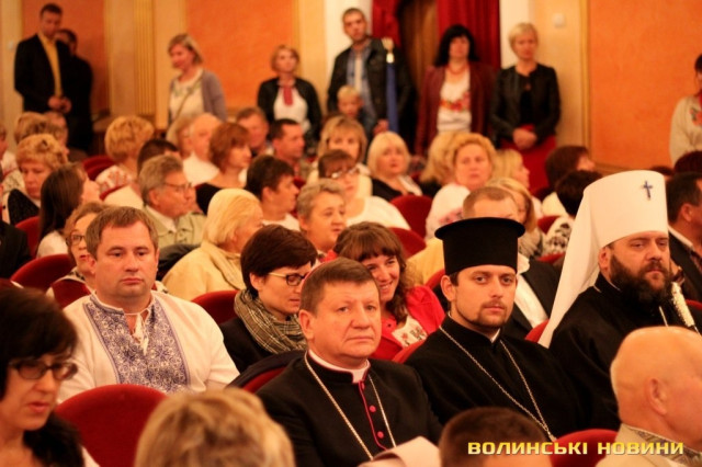 Хто пам"ять вшановує, а хто зуби щирить (пані в червоному на фото за священиками)