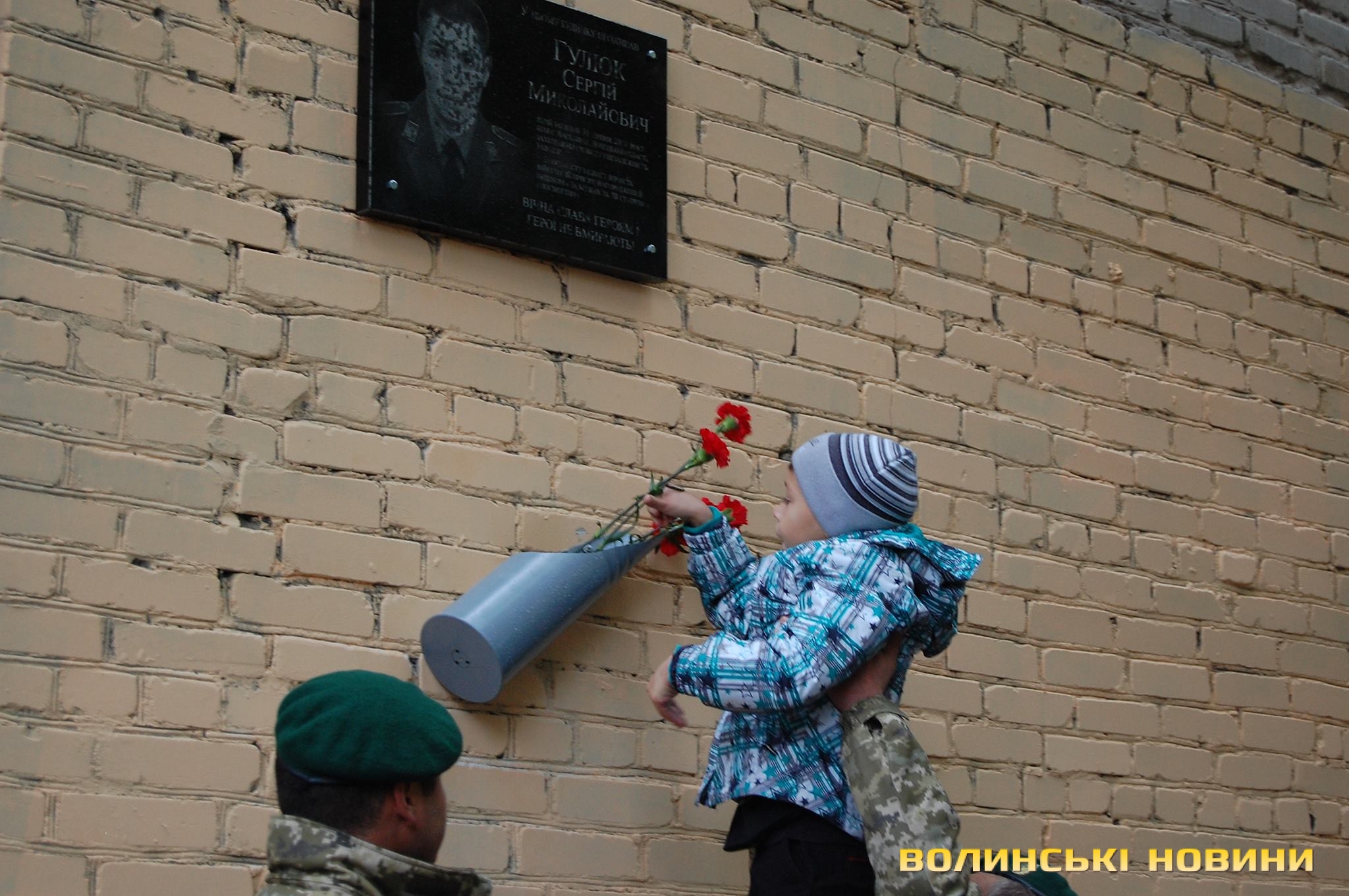 Право відкрити меморіальну дошку надали бойовим побратимам Сергія Гулюка, які були поруч з ним в останні хвилини його життя. Згодом священик прочитав молебень та освятив дошку. Слово взяв тимчасовий виконувач обов’язків начальника Луцького прикордонного загону полковник Микола Скарвінко.«Ми не забудемо той ратний подвиг, який вчинив Сергій. Ми не залишимо його сім’ю. Нехай спочиває з Богом. Простіть нам, що ми не вберегли вам батька, чоловіка та сина», - звернувся Микола Скарвінко до рідних загиблого героя.
