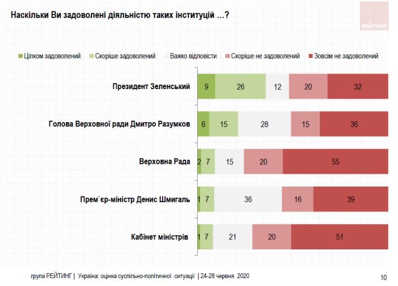 Роботою самого парламенту і уряду задоволені значно менше: лише 9% опитаних позитивно оцінили діяльність Верховної Ради (75% - негативно), 9% - діяльність глави уряду Дениса Шмигаля (негативно 56%), 8% позитивно оцінили роботу Кабміну (71% негативно).