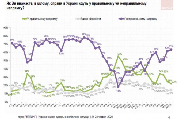 Відзначимо, що українцям властиво негативно оцінювати стан справ в країні. Кількість тих, хто вважає, що вони йдуть в правильному напрямку, перевищувало число опонентів тільки з липня по жовтень 2019 року і в січні 2020-го.Також, як свідчать дані опитування, проведеного соціологічною групою "Рейтинг", більшість українців незадоволені діяльністю української влади.