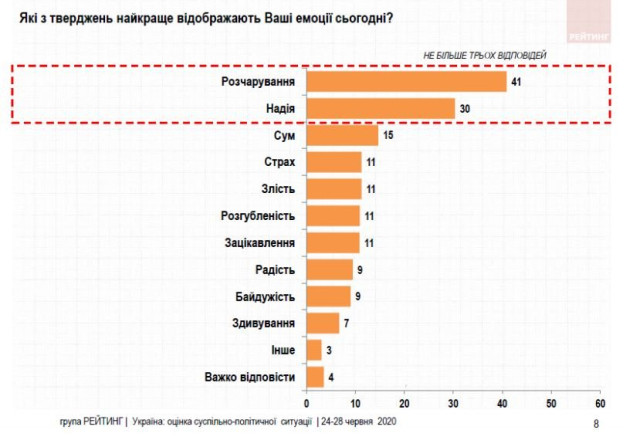 Соціологи 24-28 червня опитали 2 000 респондентів у віці понад 18 років у всіх областях, крім Криму та непідконтрольної частини Донбасу. Їм запропонували вибрати не більше трьох домінуючих на сьогодні емоцій, які вони відчувають.