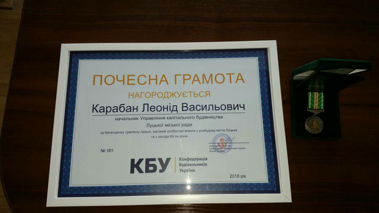 Головного будівельника Луцька відзначили за високий професіоналізм, багаторічну сумлінну працю, вагомий особистий внесок у розбудову міста та з нагоди 60-ти річчя, яке Леонід Карабан святкує 27 січня.
