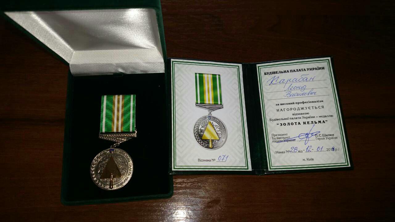 Почесною грамотою Конфедерації будівельників України та відзнакою Будівельної палати України – медаллю «Золота кельма» нагородили Леоніда Карабана.