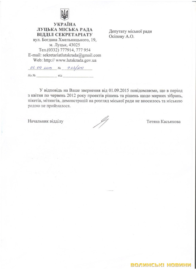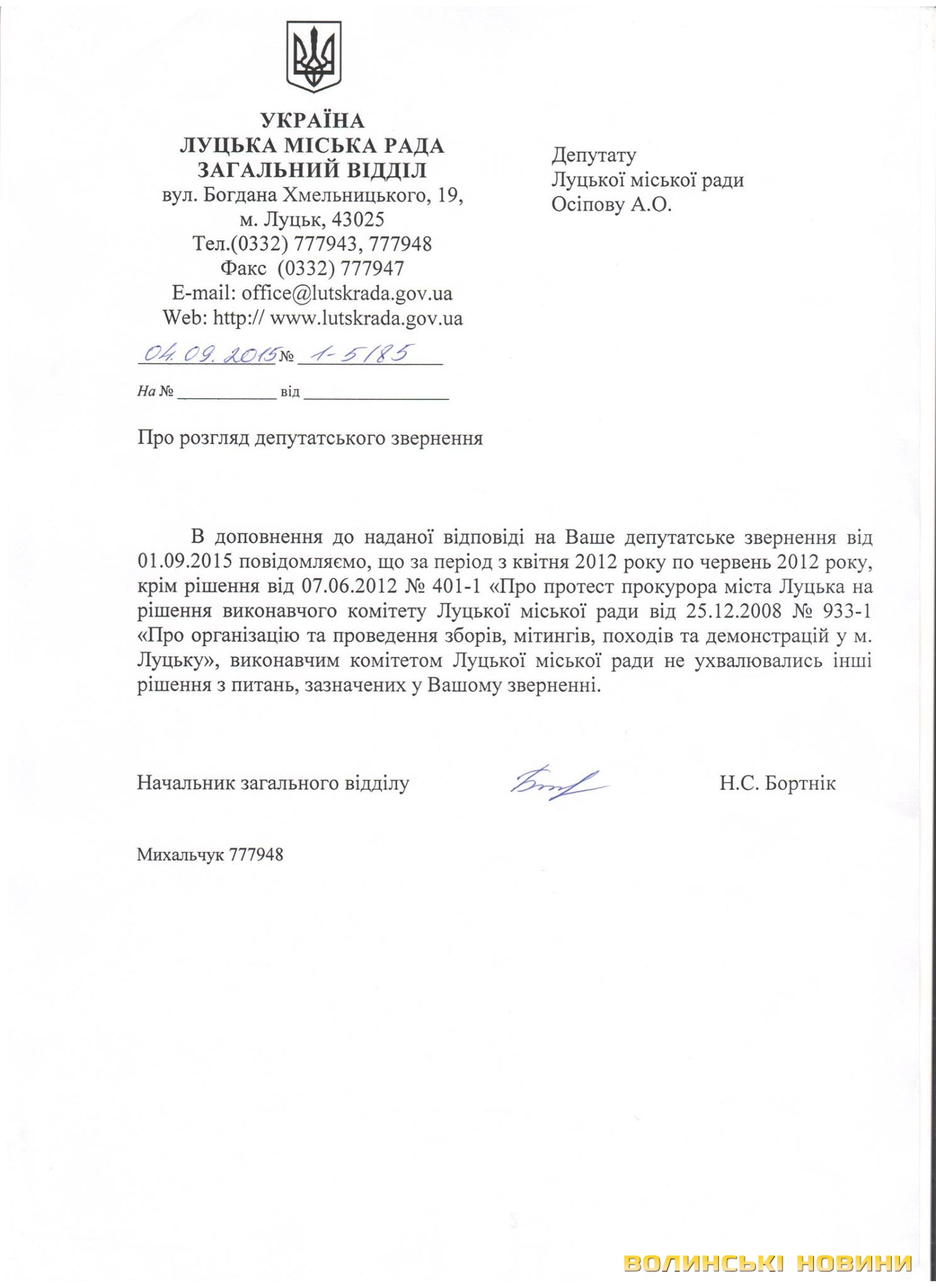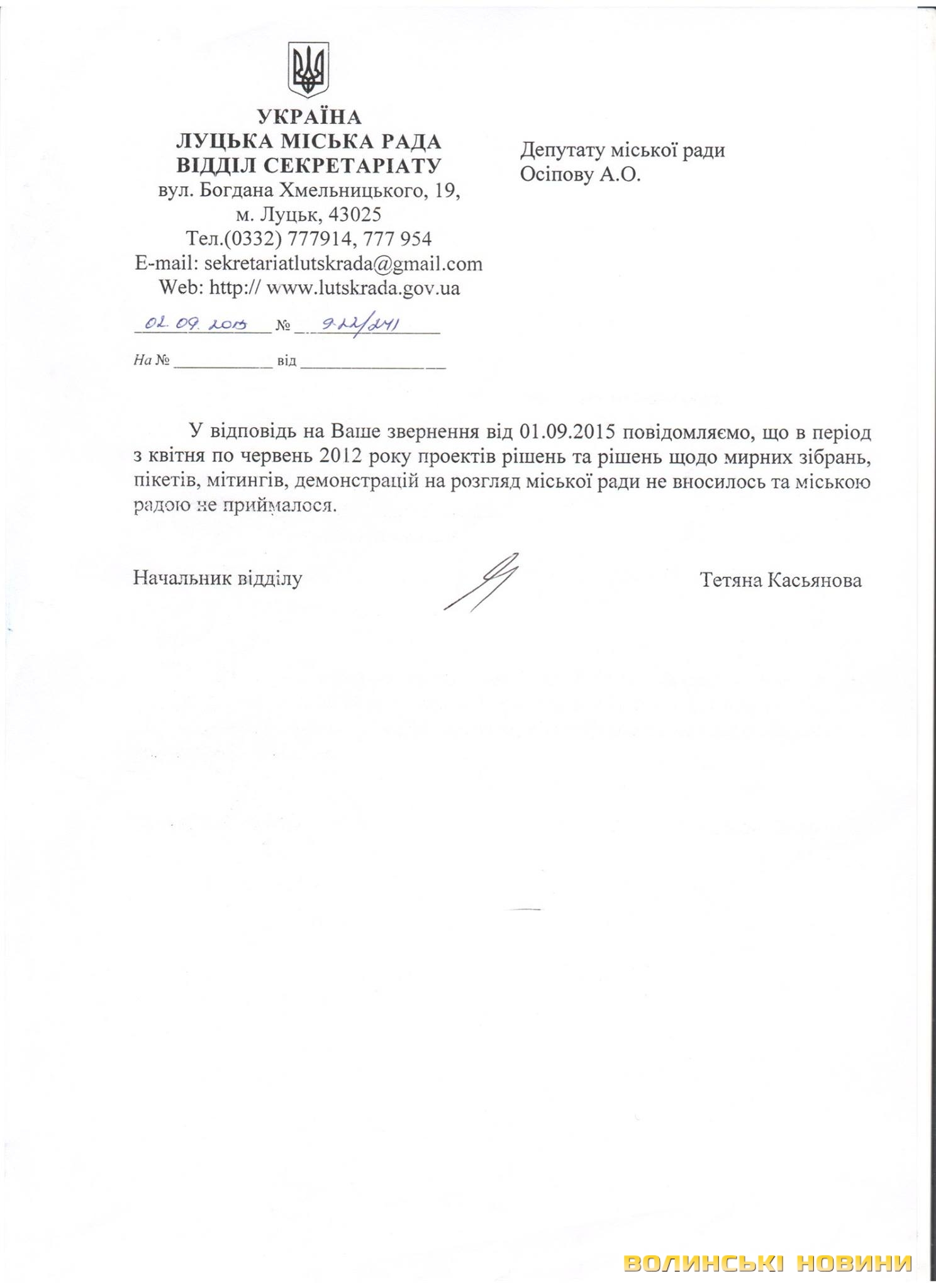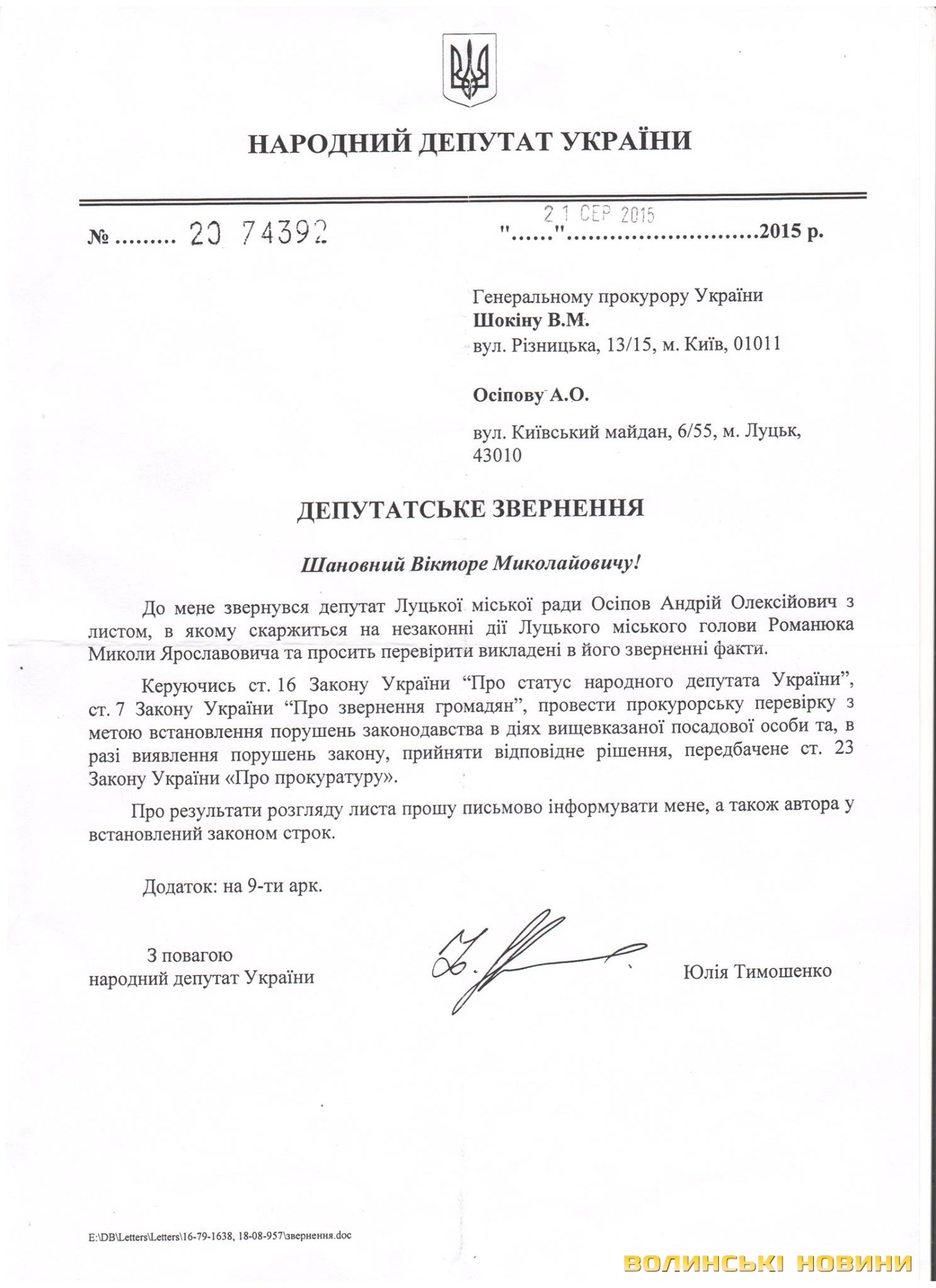 до Генпрокуратури із проханням перевірити законність дій Луцького міського голови.Крім того, Андрій Осіпов повідомив про згадане кримінальне правопорушення прокурора міста Луцька.З його слів, Генеральна прокуратура переслала звернення в обласну прокуратуру для розгляду під особистим контролем обласного прокурора. Нині депутат чекає відповіді і на матеріали, надіслані в ГПУ, і на матеріали, надані прокурору Луцька.