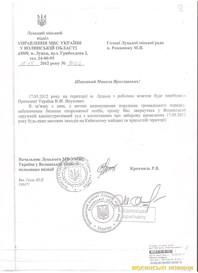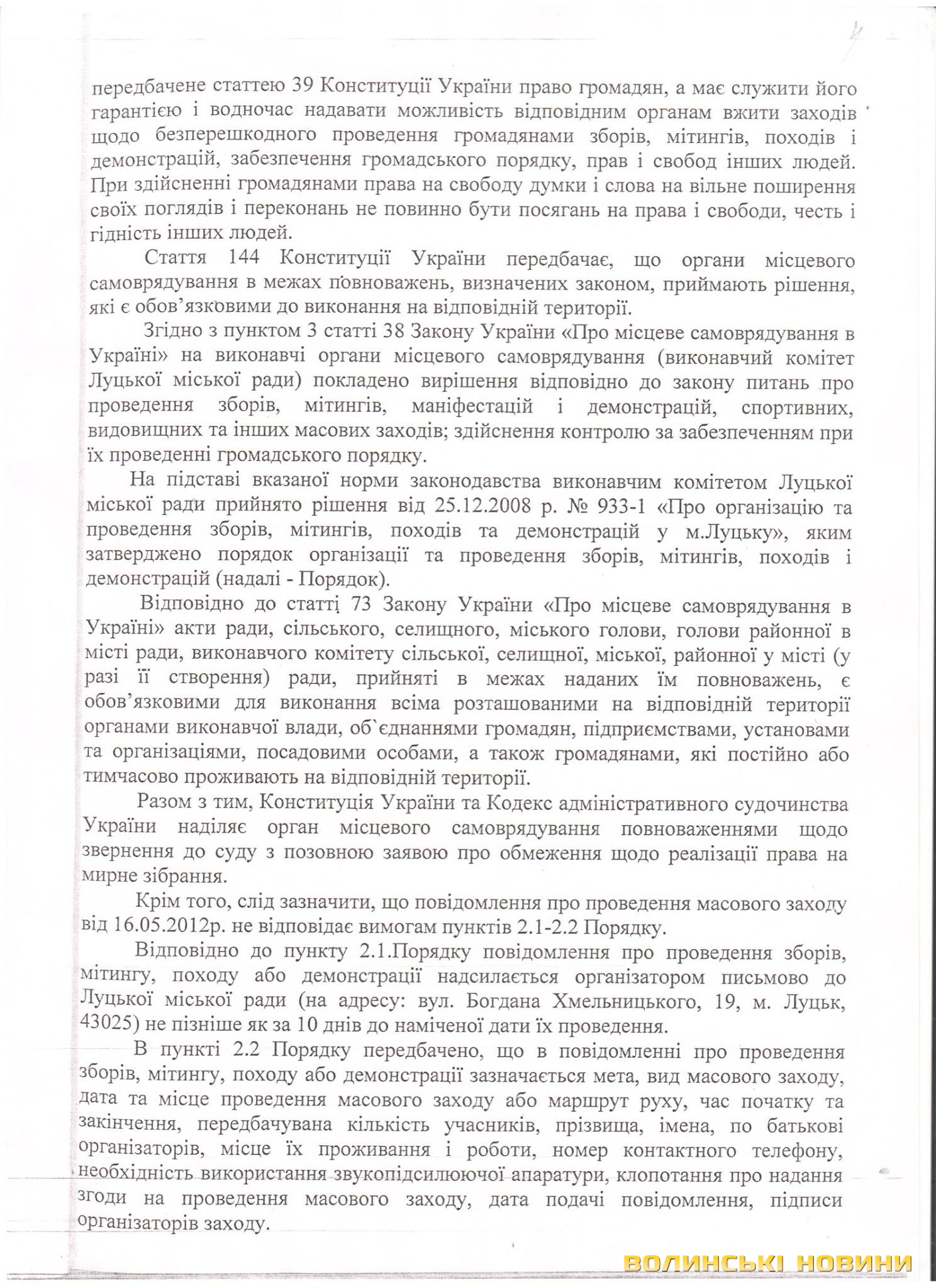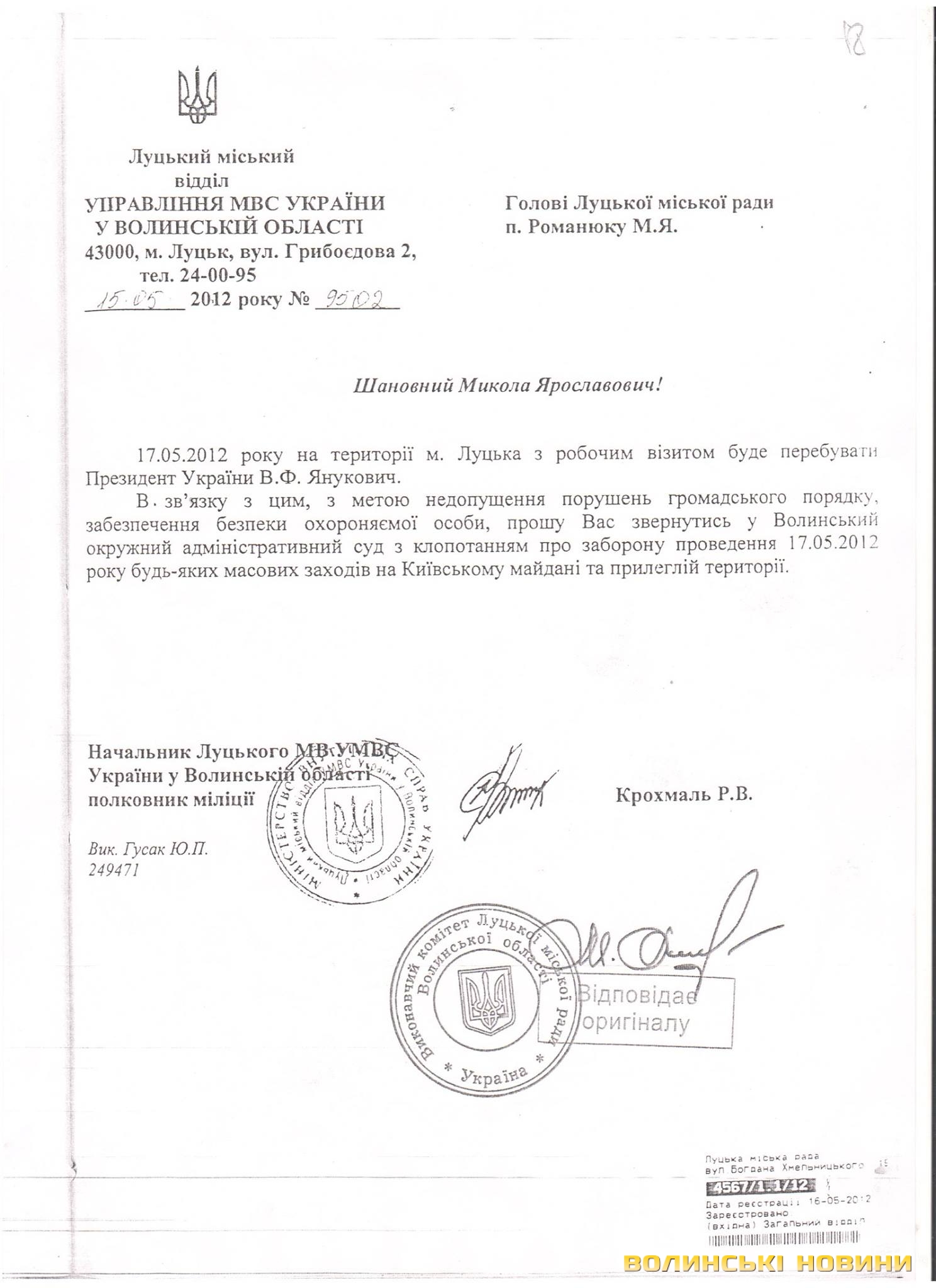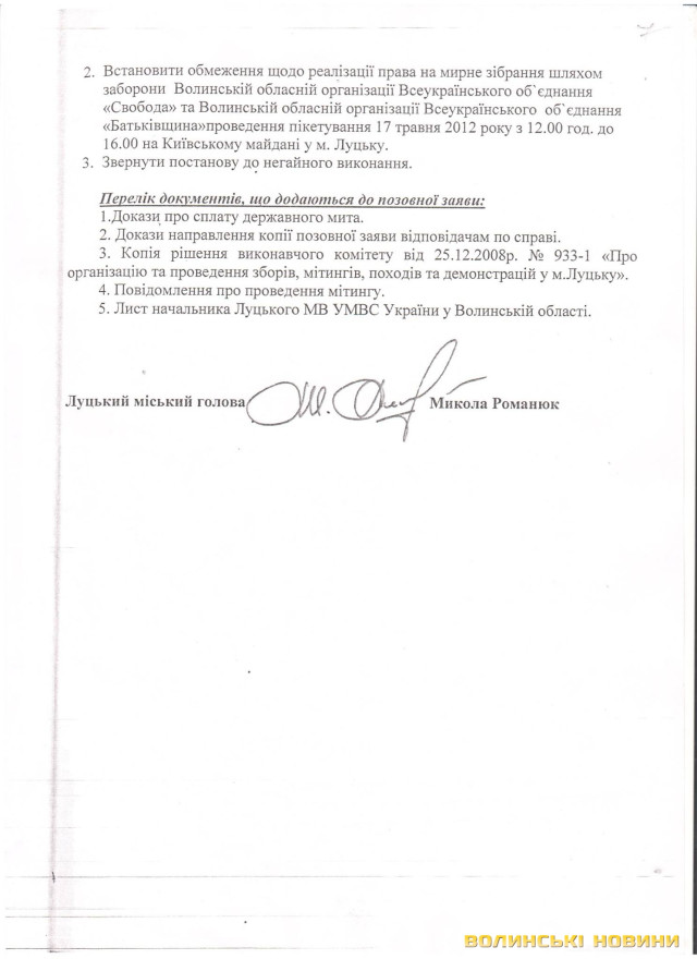 Того ж дня Луцький міський голова Микола Романюк звелів своїм підлеглим звернутися до суду з проханням заборонити проведення мирного зібрання.До слова, звернутися до суду міського голову попросили в Луцькому МВ УМВС. Лист на ім’я Миколи Романюка надійшов за підписом начальника міськвідділу Романа Крохмаля, який, після відставки, очолював відділ з питань запобігання та виявлення корупції у міськраді.Навіть тоді, коли з’ясувалось, що візит Януковича скасували, Микола Романюк не відкликав позову. Зрештою, 17 травня суд ухвалив рішення, яким задовольнив позов, і заборонив пікет. Апеляційний суд залишив рішення без змін.Зі слів Андрія Осіпова, правом забороняти пікети та мирні зібрання наділений орган місцевого самоврядування, а не особисто міський голова.