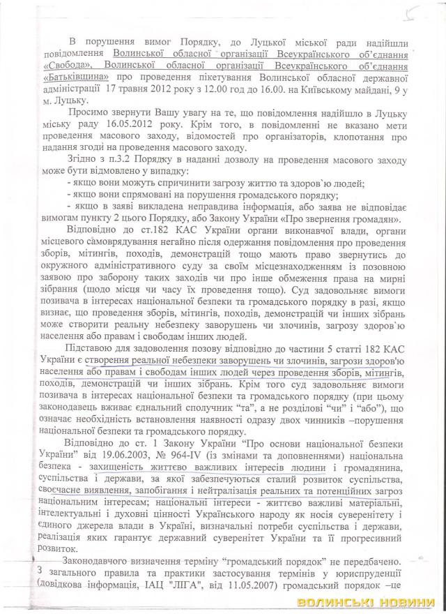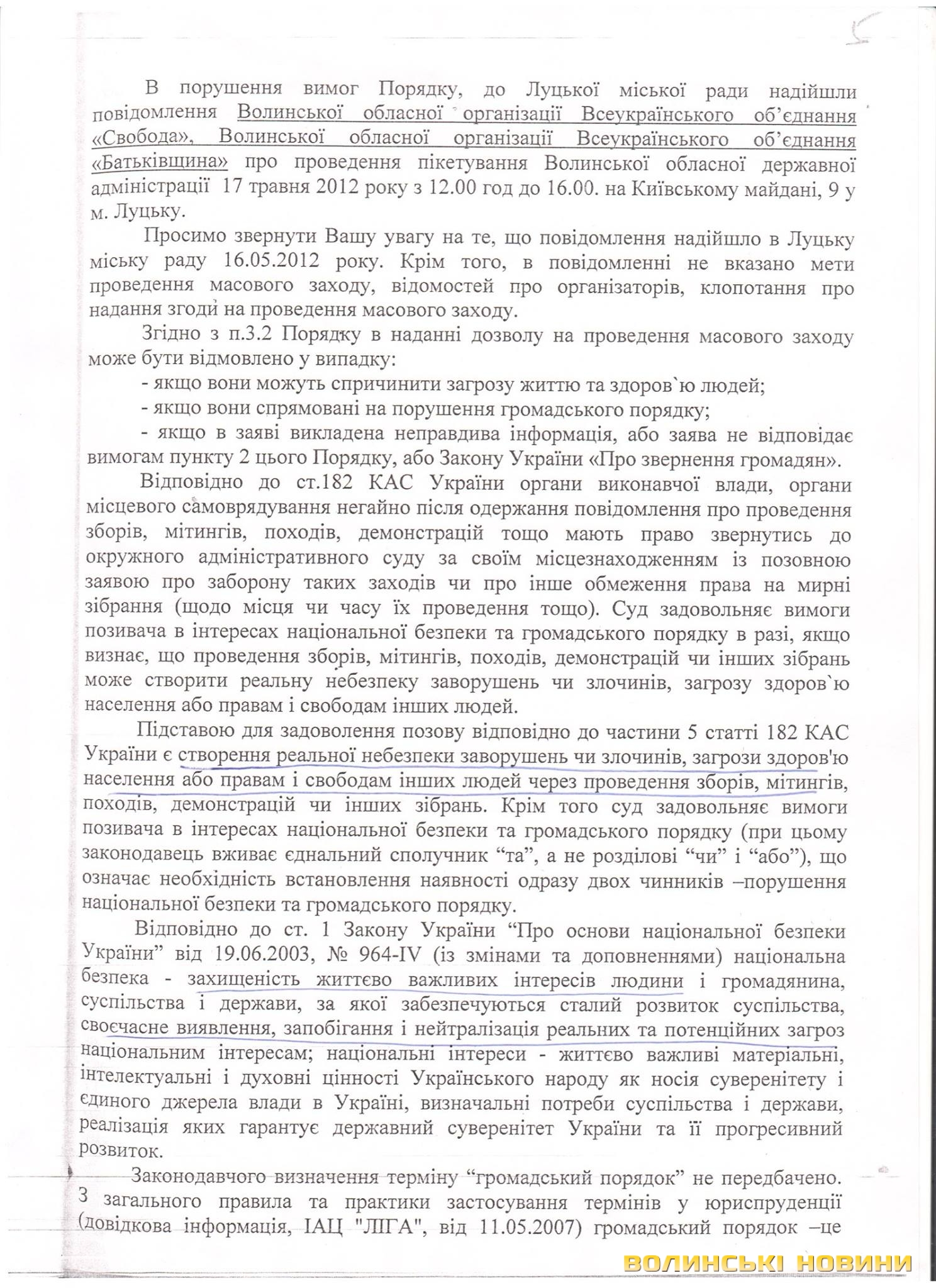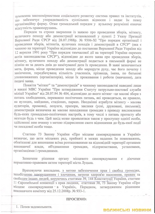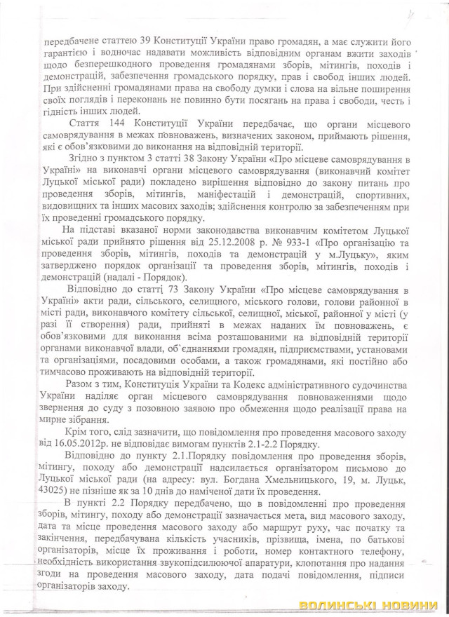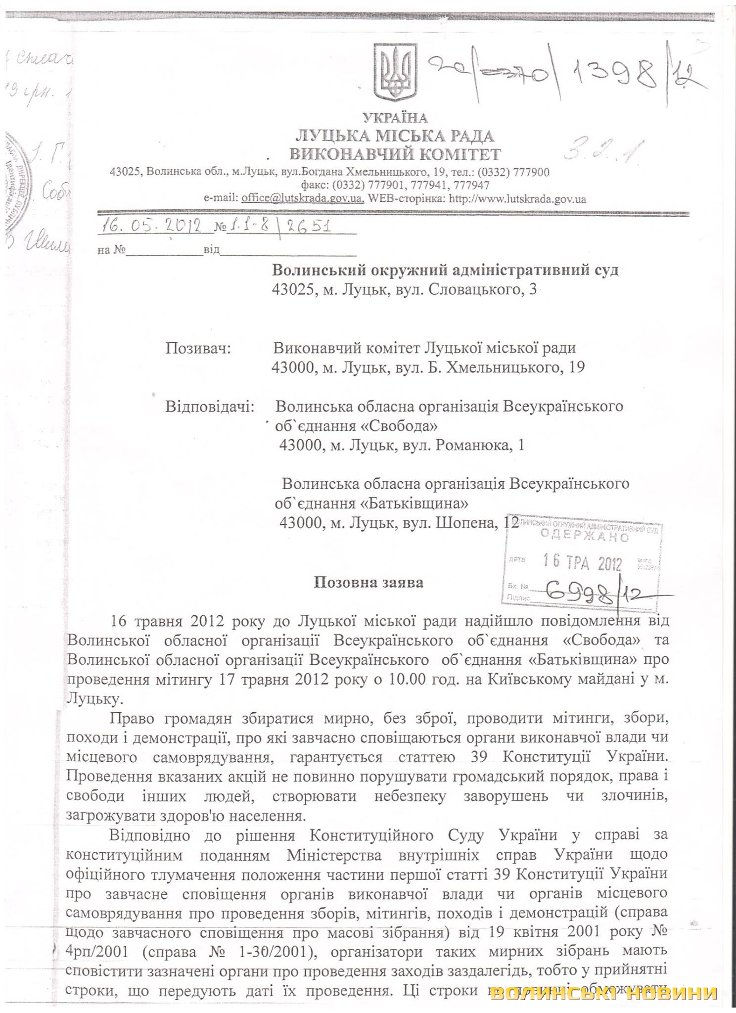 Того ж дня Луцький міський голова Микола Романюк звелів своїм підлеглим звернутися до суду з проханням заборонити проведення мирного зібрання.До слова, звернутися до суду міського голову попросили в Луцькому МВ УМВС. Лист на ім’я Миколи Романюка надійшов за підписом начальника міськвідділу Романа Крохмаля, який, після відставки, очолював відділ з питань запобігання та виявлення корупції у міськраді.Навіть тоді, коли з’ясувалось, що візит Януковича скасували, Микола Романюк не відкликав позову. Зрештою, 17 травня суд ухвалив рішення, яким задовольнив позов, і заборонив пікет. Апеляційний суд залишив рішення без змін.Зі слів Андрія Осіпова, правом забороняти пікети та мирні зібрання наділений орган місцевого самоврядування, а не особисто міський голова.