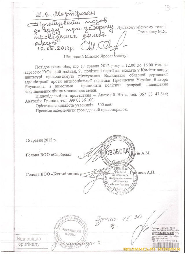 Так, 17 травня 2012 року планувався приїзд Віктора Януковича на Волинь. Напередодні, 16 травня 2012 року партії Батьківщина і Свобода подали заяву про пікет під стінами Волинської ОДА.