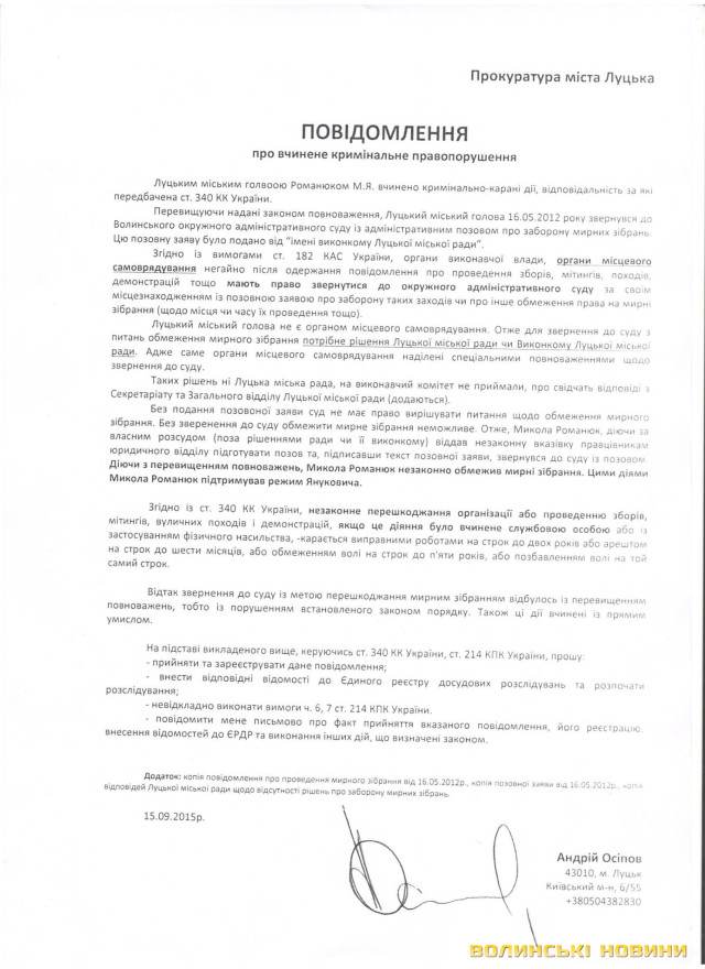 «Розпочинаючи процедуру заборони мирного зібрання, Микола Романюк перевищив повноваження. Згідно із законом, рішення про звернення до суду про обмеження мирного зібрання може прийняти місцева рада та/або її виконком. Отже, Романюк діяв протиправно, порушуючи вимоги Конституції України та Закону України «Про місцеве самоврядування в Україні», - переконує Андрій Осіпов.