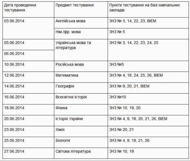 Зовнішнє незалежне оцінювання цього року відбуватиметься на базі шістнадцяти навчальних закладів (школи № 3, 4, 5, 9, 10, 14, 18, 19, 20, 21, 22, 23, 24, 25, 26, ВІЕМ). Про це повідомили у відділі інформаційної роботи міської ради.