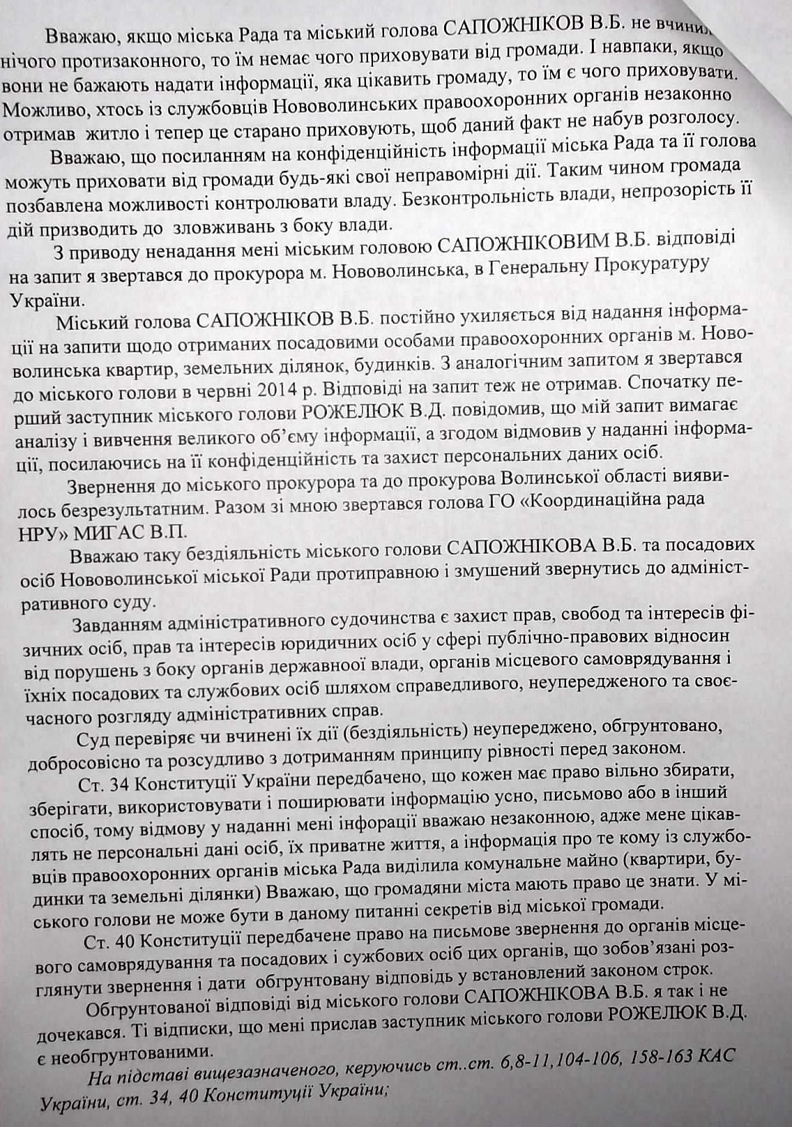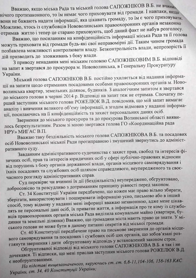 «Регулярне відписування на гербовому бланку міськвиконкому де відсутній його особистий підпис, затягування, небажання гласності, уникання прозорості та крутійство при наданні офіційних відомостей про виділення місцевою владою Нововолинська комунальних квартир, будинків та земельних ділянок під індивідуальну забудову працівникам правоохоронних органів міста. У його діях вбачається корупційна складова, а можливо й присутні елементи організованих злочинних схем», - йдеться у заяві.