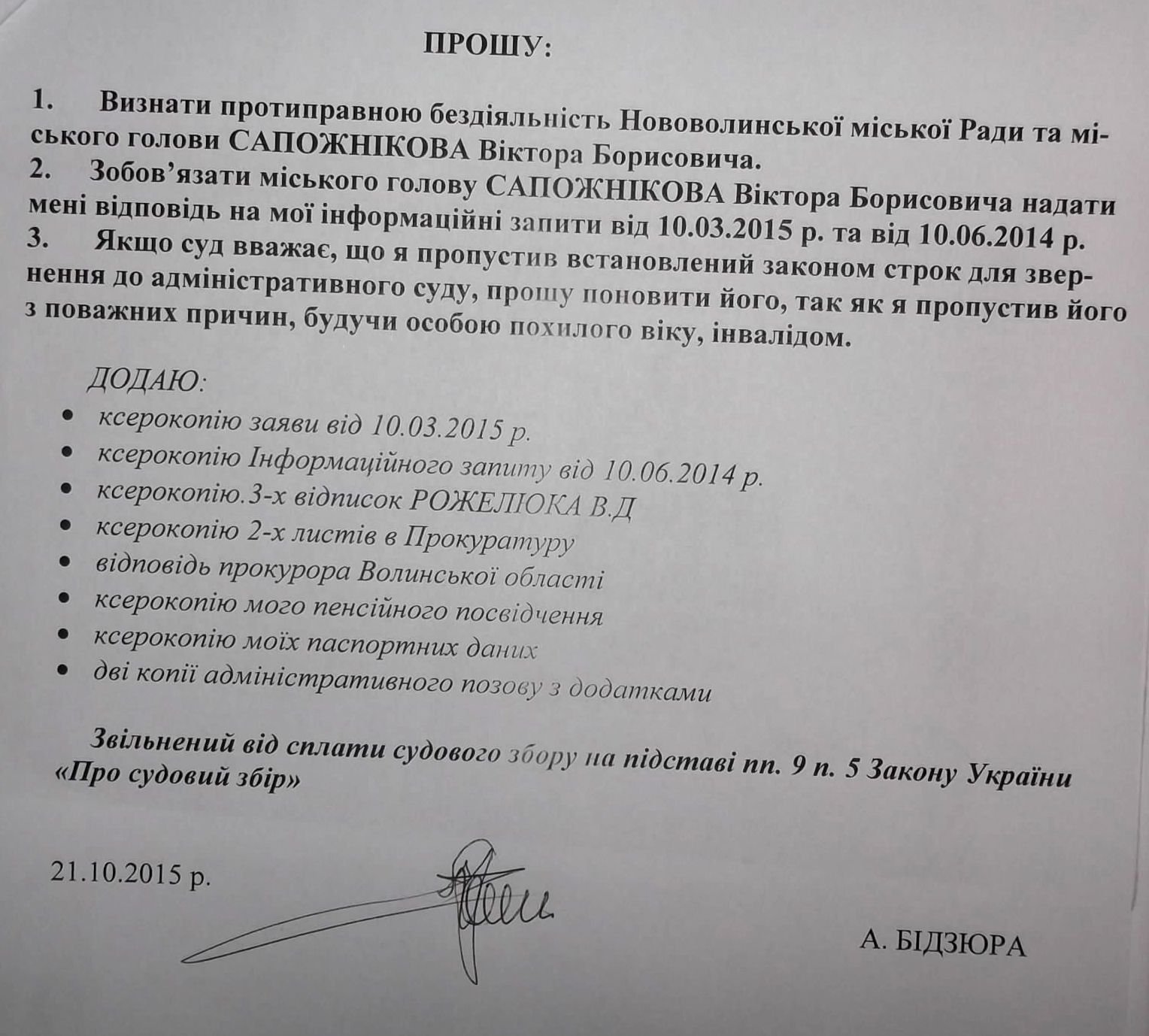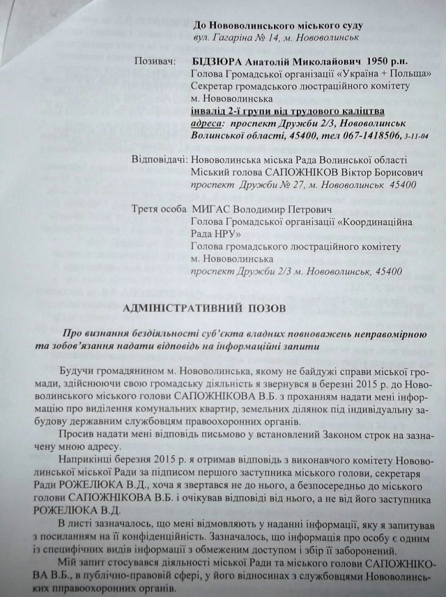 Голова громадської організації «Україна + Польща» Анатолій Бідзюра 21 жовтня 2015 року подав судовий позов у Нововолинський суд на міського голову Віктора Сапожнікова.