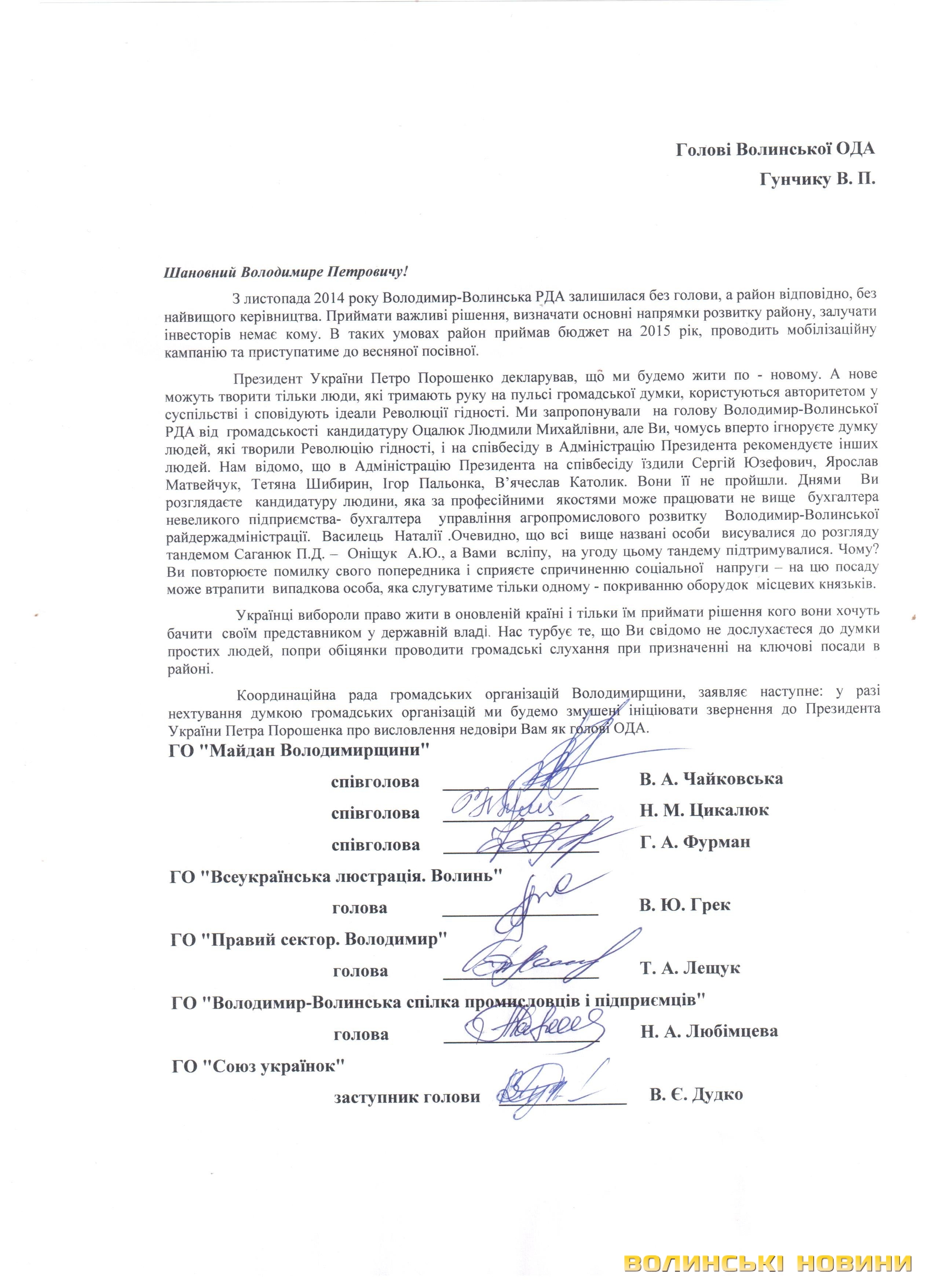 «Президент України Петро Порошенко декларував, що ми будемо жити по-новому. А нове можуть творити тільки люди, які тримають руку на пульсі громадської думки, користуються авторитетом у суспільстві і сповідують ідеали Революції гідності. Ми запропонували на голову Володимир-Волинської РДА від громадськості кандидатуру Оцалюк Людмили Михайлівни, але Ви чомусь вперто ігноруєте думку людей, які творили Революцію гідності, і на співбесіду в Адміністрацію Президента рекомендуєте інших персон. Нам відомо, що в Адміністрацію Президента на співбесіду їздили Сергій Юзефович, Ярослав Матвейчук, Тетяна Шибирин, Ігор Пальонка, В’ячеслав Католик. Вони її не пройшли. Днями ви розглядаєте кандидатуру людини, яка за професійними якостями може працювати не вище бухгалтера невеликого підприємства – бухгалтера управління агропромислового розвитку Володимир-Волинської райдержадміністрації Василець Наталії. Очевидно, усі вище названі особи висувалися до розгляду тандемом Саганюк П. Д. – Оніщук А. Ю., а Вами всліпу, на угоду цьому тандему підтримувалися. Чому?», - запитують губернатора активісти і застерігають не повторювати помилки свого попередника та не призначити на цю посаду випадкову особу, яка слугуватиме прикриванню оборудок місцевих князьків.