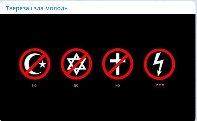У Telegram-каналі «Твереза і зла молодь» постять картинки з антиісламським, юдофобським і антихристиянським підтекстами. Перебувають у цьому пабліку близько 70 осіб.