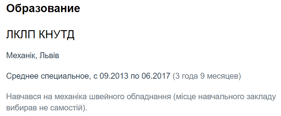 «Навчався на механіка швейного обладнання (місце навчання вибирав не самостійно)», - пише він.
