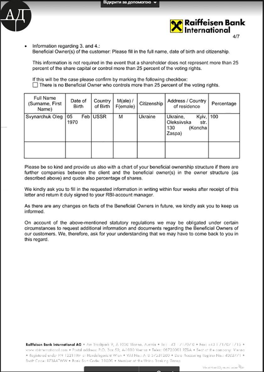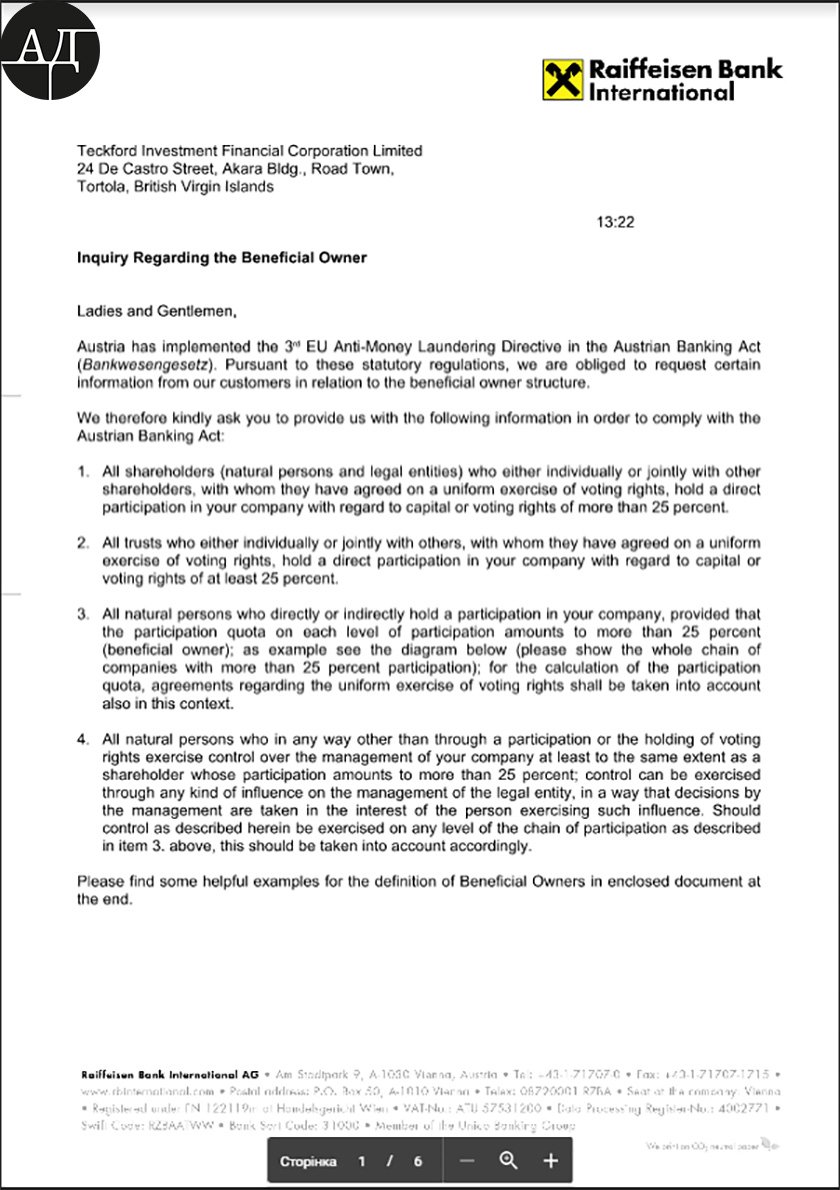 Щоб відразу зняти звинувачення з боку Пана Гладковського про неправдивість нашого розслідування привожу як доказ лист його офшорній компанії «Teckford Investments Financial Corporation» австрійському банку «Raiffeisen Bank International» про справжнє бенефіціарство Олега Володимировича.