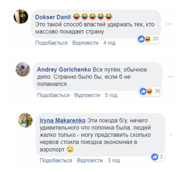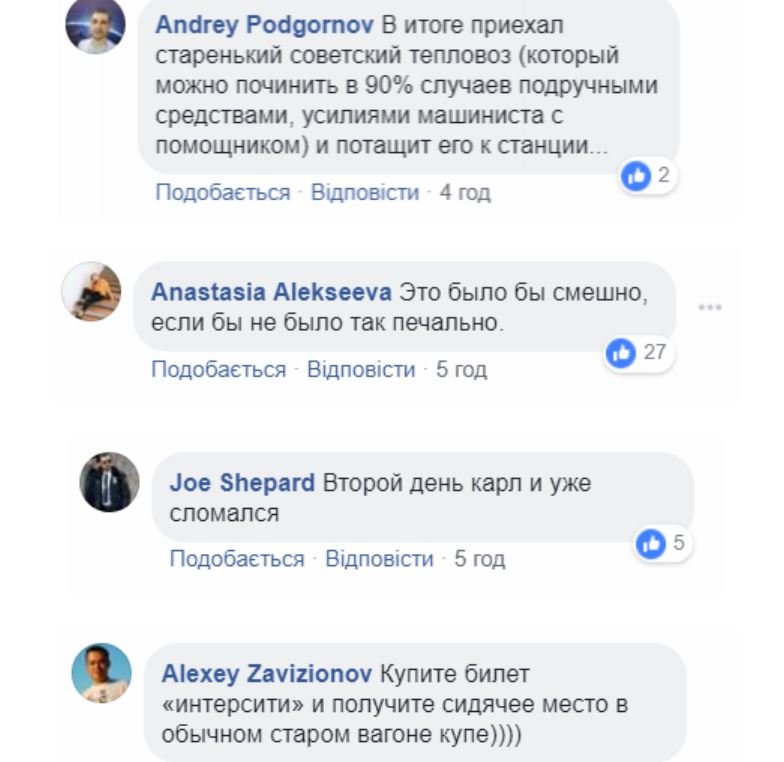 «Це такий спосіб влади утримати тих, хто масово покидає країну», «Скільки баблішка було відмито на придбанні цього «дива», «Це було б смішно, якби не було так сумно», «Все в нормі, звичайна справа. Дивно, якби не поламався», «Купуйте квиток „Інтерсіті“ і отримаєте сидяче місце в звичайному старому вагоні купе», — пишуть коментатор