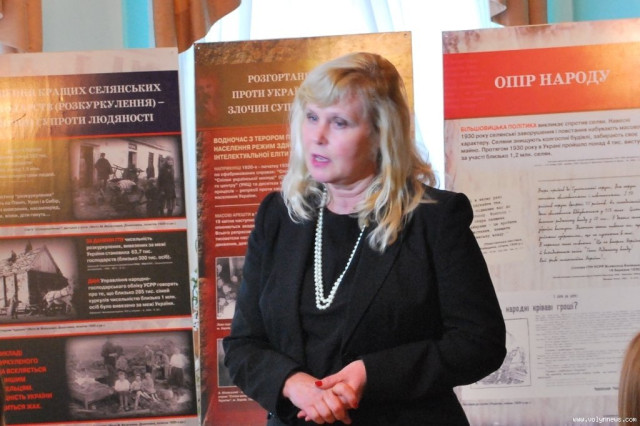 Завідувач відділу новітньої історії обласного краєзнавчого музею Валентина Мишлай розповідає, що експонати виставки ілюструють Голодомор від самого початку – розповідають про історичні передумови, представлені тексти законів, які зобов’язували забирати в людей останній шматок хліба.