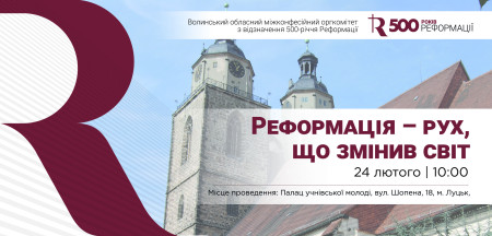 24 лютого о 10:00 у Палаці учнівської молоді (Луцьк, вулиця Шопена,18) відбудеться просвітницький захід «Реформація – рух, що змінив світ». Організатори запрошують істориків і освітян Луцька та області ознайомитися з історичним та богословським контекстом Реформації та наслідками історичної події.