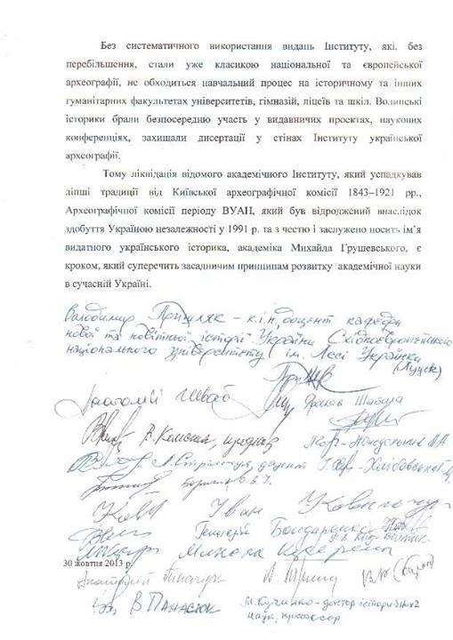 «Без систематичного використання видань Інституту, які, без перебільшення, стали уже класикою національної та європейської археографії, не обходиться навчальний процес на історичному та інших гуманітарних факультетах університетів, гімназій, ліцеїв та шкіл. Волинські історики брали безпосередню участь у видавничих проектах, наукових конференціях, захищали дисертації у стінах Інституту української археографії», – йдеться в листі.