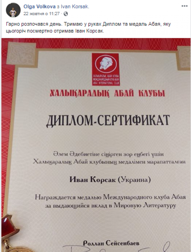 «Івана Корсака знаю вже давно. Я його щиро поважав, він був справжній подвижник, член нашої Академії. Тому за визначний вклад у світову літературу цього року почесною медаллю Абая нагородили Івана Корсака. Нагороду передали менеджеру з маркетингу VolWest Group Ользі Волковій», – розповів Сергій Дзюба.