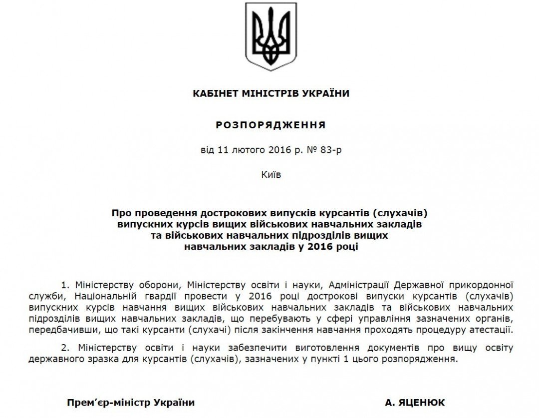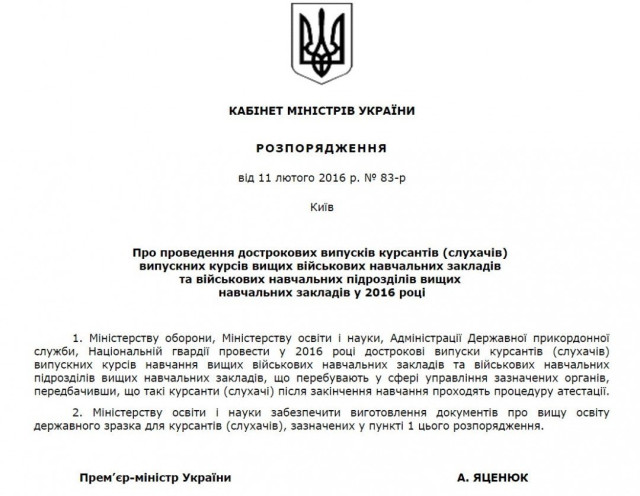 Уряд ухвалив розпорядження про проведення у 2016 році дострокового випуску курсантів (слухачів) випускних курсів військових ВНЗ та військових навчальних підрозділів вищих навчальних закладів, що належать до сфери управління Міноборони, Адміністрації Державної прикордонної служби та Національної гвардії, - повідомляє Укрінформ.