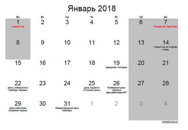 У цілому в січні буде 10 вихідних днів, включаючи звичайні вихідні та святкові дні. Передсвяткових робочих днів, скорочених на годину, не передбачено.