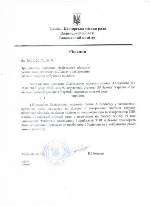 Виконавчий комітет Камінь-Каширської міської ради обговорив звернення мера Львова Андрія Садового з проханням тимчасово допомогти львів'янам у захороненні частини твердих побутових відходів, однак відмовив у його задоволенні, повідомляє Район. Камінь.