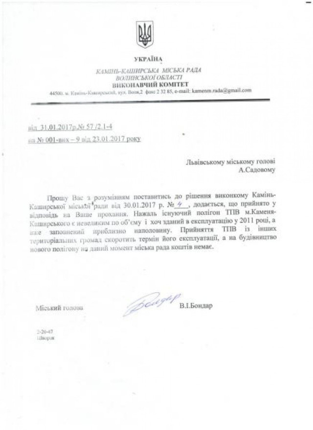 Відтак голова Камінь-Каширської міської ради Василь Бондар відповів у листі Андрію Садовому, що, на жаль, існуючий полігон ТПВ Каменя-Каширського є невеликим по об'єму і хоч зданий в експлуатацію у 2011 році, а вже заповнений приблизно на половину. Тож прийняття ТПВ із інших територіальних громад скоротить термін його експлуатації.